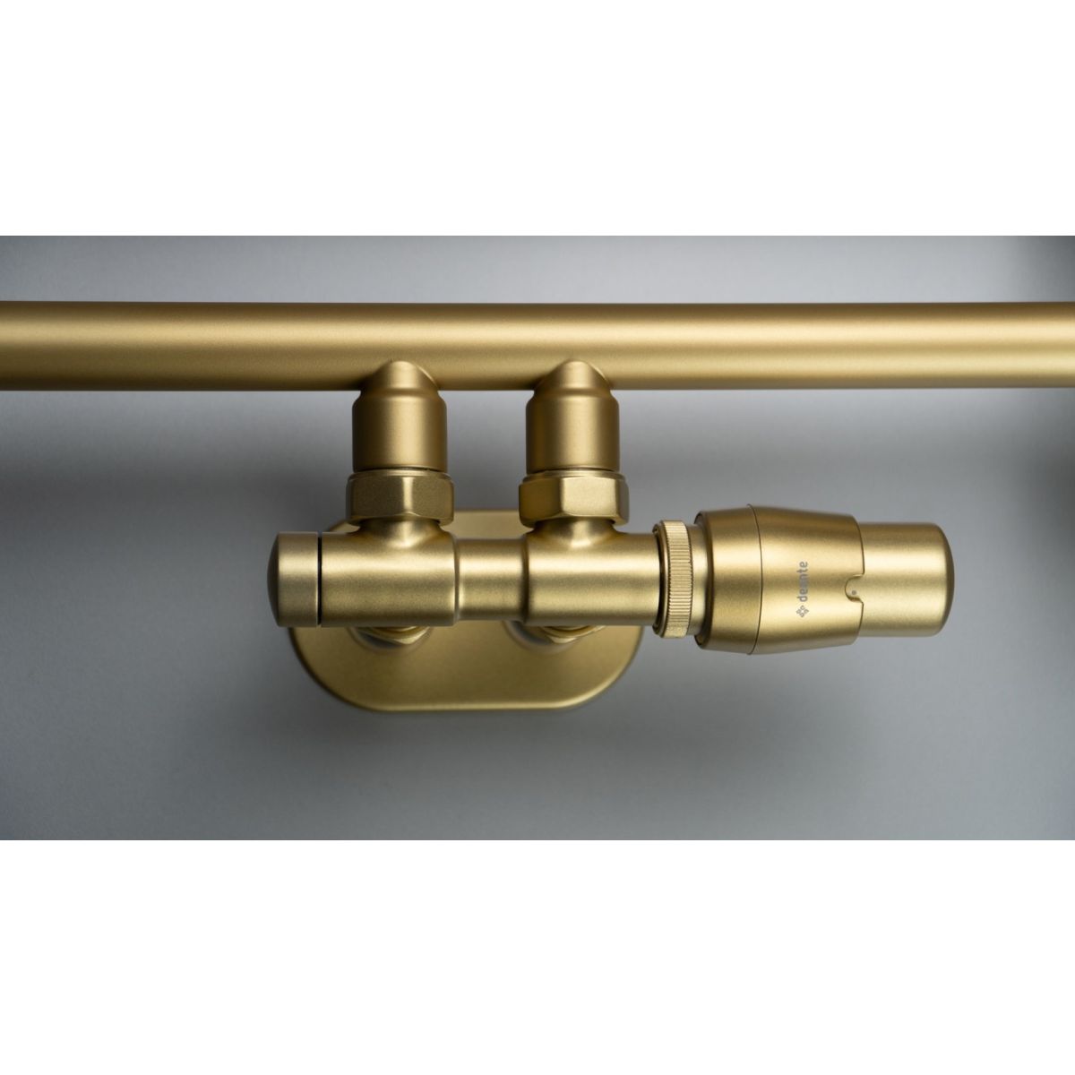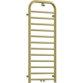 Der matte goldene Badheizkörper mit den Maßen 1210 x 500 zeichnet sich durch seine abgerundete Form und seine einzigartige Oberfläche aus. Er verfügt über einen praktischen Haken für Handtücher oder Bademäntel, was seine Funktionalität erhöht. Hybridmodell: Wasser-Elektro-Heizkörper mit der Möglichkeit, einen optionalen 400-W-Heizstab zu montieren, der außerhalb der Heizperiode für zusätzliche Wärme oder zum Trocknen von Handtüchern sorgt. Für den Heizkörper muss ein Ventil zusätzlich erworben werden. Sowohl der optionale Heizstab als auch das erforderliche Ventil sind in derselben Farbe wie der Heizkörper erhältlich.