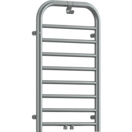 Der stilvolle Badheizkörper in mattem Stahlfarbton, Größe 850x500, zeichnet sich durch seine abgerundeten Formen und seine hohe Verarbeitungsqualität aus. Er ist mit einem praktischen Haken für Handtücher oder Bademäntel ausgestattet. Es handelt sich um ein Hybridmodell: ein Wasser-Elektro-Modell mit der Möglichkeit, einen 400-W-Heizkörper hinzuzufügen, der außerhalb der Heizperiode für zusätzliche Wärme oder zum Trocknen von Handtüchern sorgt. Für den Heizkörper muss ein Ventil zusätzlich erworben werden. Sowohl das optionale Heizelement als auch das erforderliche Ventil sind in derselben Farbe wie der Heizkörper erhältlich.