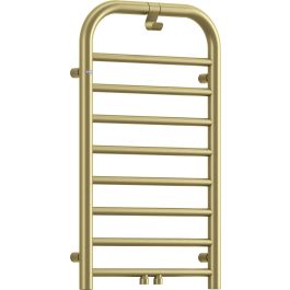 Der goldene, matte Badheizkörper mit den Maßen 850 x 500 mm zeichnet sich durch seine elegante, abgerundete Form und seine einzigartige Oberfläche aus, die dem Innenraum einen luxuriösen Charakter verleiht. Die Praktikabilität dieses Modells wird durch einen eingebauten Haken erhöht, der sich ideal für Handtücher oder Bademäntel eignet. Der Heizkörper ist ein Hybridmodell, das Wasser- und Elektro-Funktionen kombiniert und mit einem optionalen 400-W-Heizelement ausgestattet werden kann, das außerhalb der Heizperiode für zusätzliche Wärme oder zum Trocknen von Handtüchern sorgt. Es muss ein passendes Ventil gekauft werden, das – ebenso wie das optionale Heizelement – in derselben Farbe wie der Heizkörper erhältlich ist.