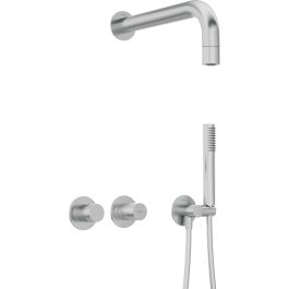 Das Unterputz-Set Silia Hexa ist eine harmonische Verbindung von moderner Technologie und exklusivem Design. Es stammt aus der Jubiläums-Limitierten Serie Hexa, die Teil der Top-Kollektion Silia ist. Sein Markenzeichen ist ein juwelenartiger Hebel mit einer präzise gefrästen, geometrischen Struktur, der das Licht subtil reflektiert und den einzigartigen Charakter der Armatur unterstreicht. Das Set besteht aus einem Wandauslauf mit Duschkopf, einer Unterputzarmatur, einem Schlauch, einer Handbrause und einem Winkelanschluss. Die Armatur ist mit einem keramischen, mechanischen Funktionsschalter ausgestattet, der einen reibungslosen und präzisen Wechsel der Wasserquelle garantiert. Der Messing-Duschkopf verfügt über ein Anti-Calc-System, das Kalkablagerungen wirksam reduziert und die Reinigung erleichtert. Der Duschschlauch verfügt über die Anti-Twist-Technologie, die ein Verdrehen während des Gebrauchs verhindert. Der Duschkopf aus hochwertigem Edelstahl bietet einen angenehmen Regenstrom für ein entspannendes Badeerlebnis. Ein weiterer Vorteil ist der bewegliche Winkelanschluss, mit dem die Position des Duschkopfs eingestellt werden kann, was den Bedienkomfort erhöht. Das Ganze ist in elegantem gebürstetem Stahl gehalten, der den minimalistischen und modernen Charakter des Badezimmers unterstreicht und ihm ein stilvolles und raffiniertes Aussehen verleiht.