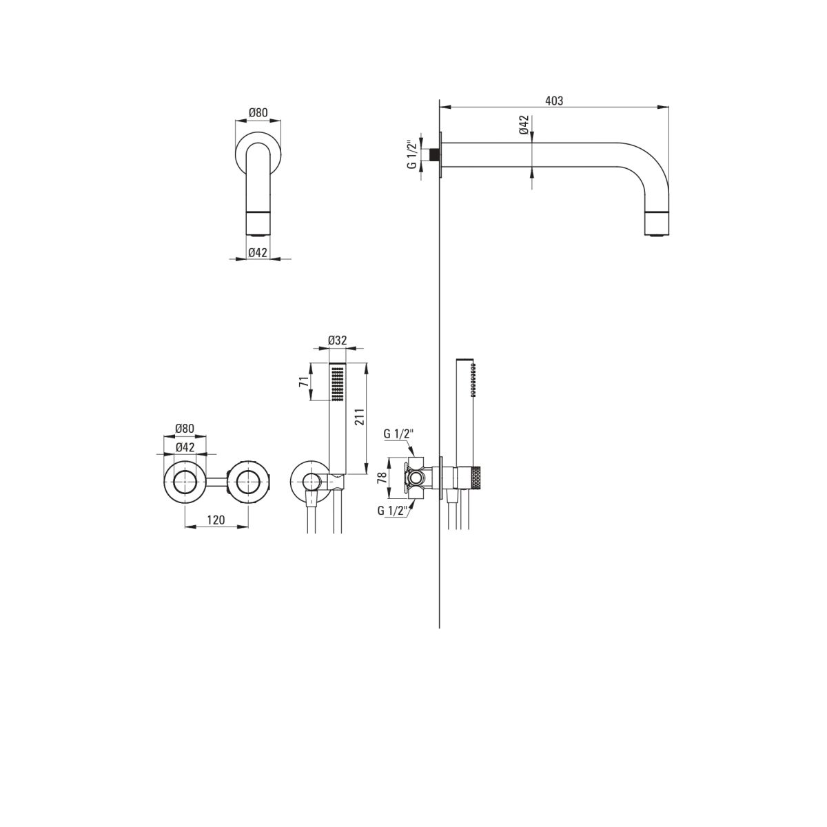 - Inbegriffen: Batterie mit Schalter, Duschkopf, Duschkopf, Duschschlauch, Eckanschluss