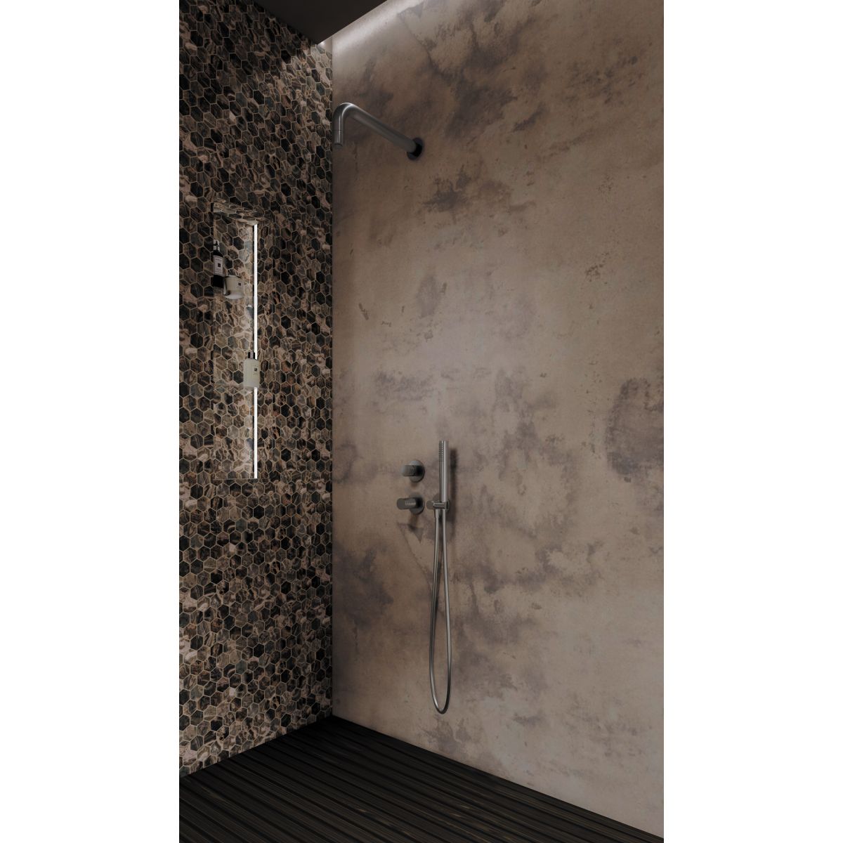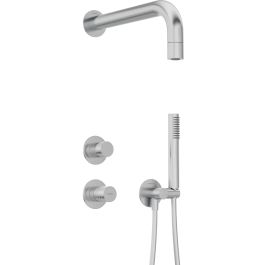 Das Unterputz-Set Silia Hexa ist eine harmonische Verbindung von moderner Technologie und exklusivem Design. Es stammt aus der Jubiläums-Sonderedition Hexa, die Teil der Top-Kollektion Silia ist. Sein Markenzeichen ist ein juwelenartiger Hebel mit einer präzise gefrästen, geometrischen Struktur, die das Licht subtil reflektiert und den einzigartigen Charakter der Armatur unterstreicht. Das Set besteht aus einem Wandauslauf mit Duschkopf, einer Unterputzarmatur, einem Schlauch, einer Handbrause und einem Winkelanschluss. Die Armatur ist mit einem keramischen, mechanischen Funktionsschalter ausgestattet, der einen reibungslosen und präzisen Wechsel der Wasserquelle garantiert. Der Messing-Duschkopf verfügt über ein Anti-Calc-System, das Kalkablagerungen wirksam reduziert und die Reinigung erleichtert. Der Duschschlauch verfügt über die Anti-Twist-Technologie, die ein Verdrehen während des Gebrauchs verhindert. Der Duschkopf aus hochwertigem Edelstahl bietet einen angenehmen Regenstrom für ein entspannendes Badeerlebnis. Ein weiterer Vorteil ist der bewegliche Winkelanschluss, mit dem die Position des Duschkopfs eingestellt werden kann, was den Bedienkomfort erhöht. Das Ganze ist in elegantem gebürstetem Stahl ausgeführt, der den minimalistischen und modernen Charakter des Badezimmers unterstreicht und ihm ein stilvolles und raffiniertes Aussehen verleiht.