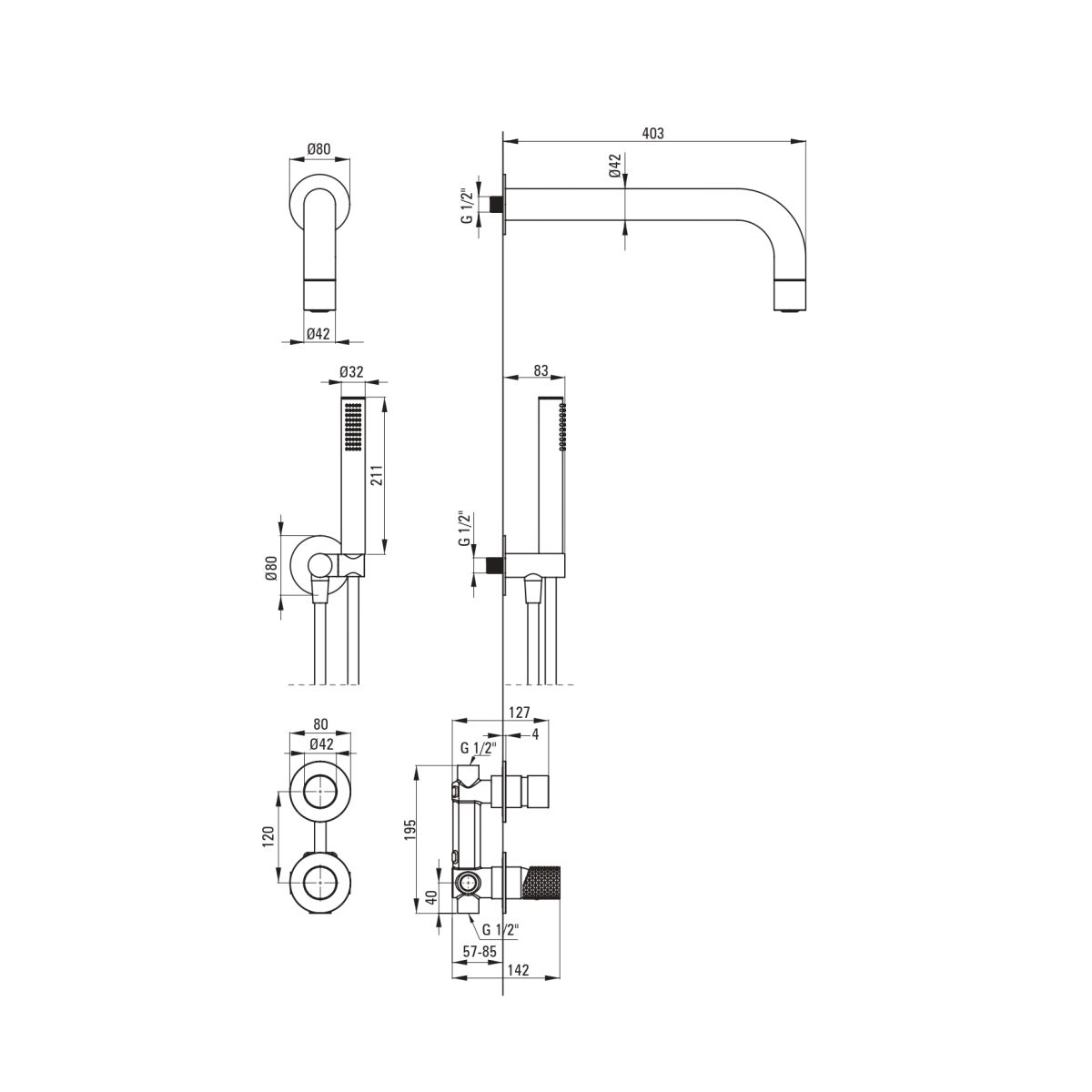- Inbegriffen: Batterie mit Schalter, Duschkopf, Duschkopf, Duschschlauch, Eckanschluss