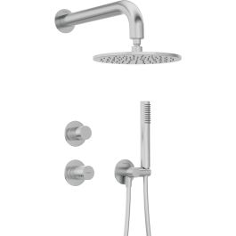 Das Unterputz-Set Silia Hexa ist eine harmonische Verbindung von moderner Technologie und exklusivem Design. Es stammt aus der Jubiläums-Sonderedition Hexa, die Teil der Top-Kollektion Silia ist. Sein Markenzeichen ist ein juwelenartiger Hebel mit einer präzise gefrästen, geometrischen Struktur, die das Licht subtil reflektiert und den einzigartigen Charakter der Armatur unterstreicht. Das Set besteht aus einem Wandauslauf mit Duschkopf, einer Unterputzarmatur, einem Schlauch, einer Handbrause und einem Winkelanschluss. Die Armatur ist mit einem keramischen, mechanischen Funktionsschalter ausgestattet, der einen reibungslosen und präzisen Wechsel der Wasserquelle garantiert. Der Messing-Duschkopf verfügt über ein Anti-Calc-System, das Kalkablagerungen wirksam reduziert und die Reinigung erleichtert. Der Duschschlauch verfügt über die Anti-Twist-Technologie, die ein Verdrehen während des Gebrauchs verhindert. Die aus hochwertigem Edelstahl gefertigte Duschbrause bietet einen angenehmen Regenstrom für ein entspannendes Badeerlebnis. Ein weiterer Vorteil ist der bewegliche Winkelanschluss, mit dem die Position des Duschkopfs eingestellt werden kann, was den Bedienkomfort erhöht. Das Ganze ist in elegantem gebürstetem Edelstahl ausgeführt, der den minimalistischen und modernen Charakter des Badezimmers unterstreicht und ihm ein stilvolles und raffiniertes Aussehen verleiht.