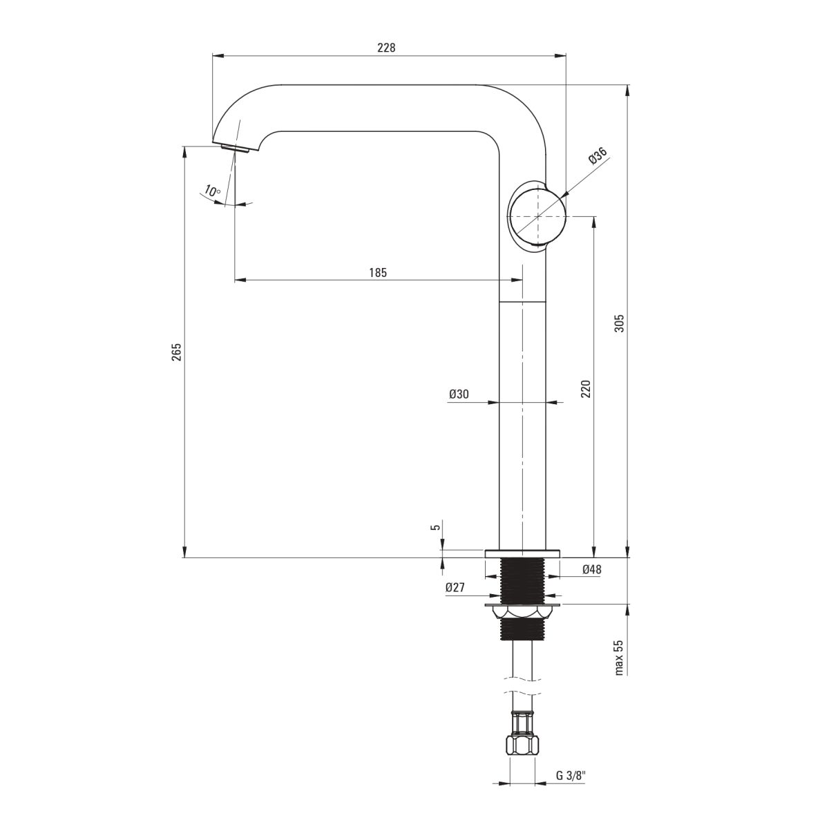 - Gewinde von der Installation: 3/8''