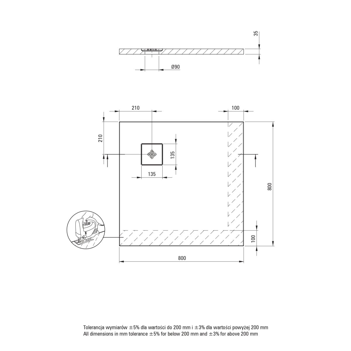 - SOLID PLUS-Technologie – Verbundstofffüllung, Möglichkeit zum Zuschneiden der Duschwanne im auf der Zeichnung markierten Bereich