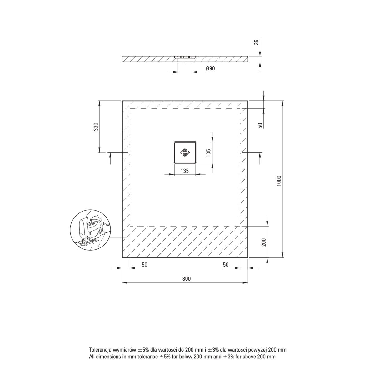 - SOLID PLUS-Technologie – Verbundstofffüllung, Möglichkeit zum Zuschneiden der Duschwanne im auf der Zeichnung markierten Bereich