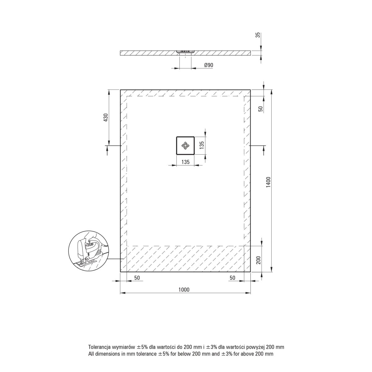- SOLID PLUS-Technologie – Verbundstofffüllung, Möglichkeit zum Zuschneiden der Duschwanne im auf der Zeichnung markierten Bereich
