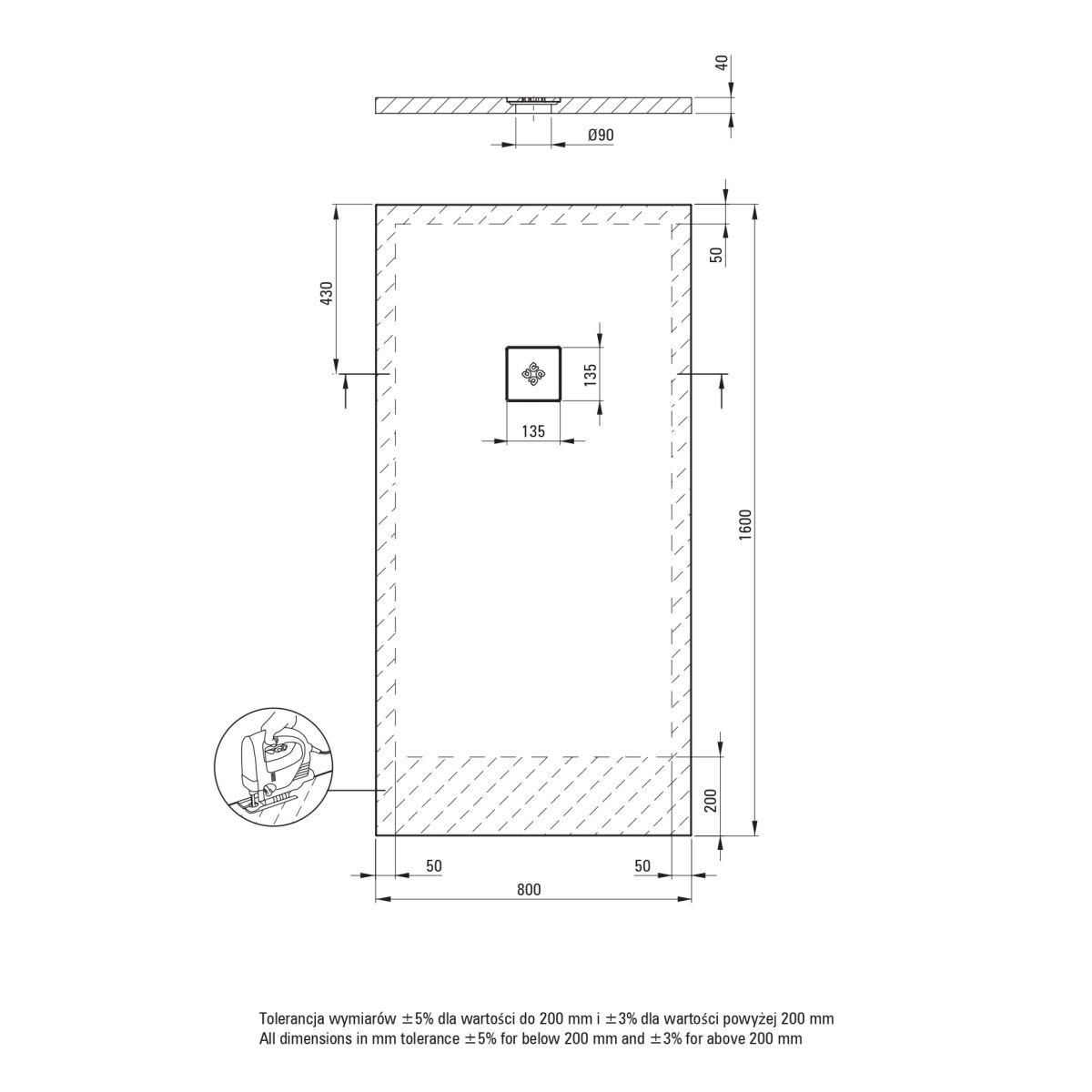 - SOLID PLUS-Technologie – Verbundstofffüllung, Möglichkeit zum Zuschneiden der Duschwanne im auf der Zeichnung markierten Bereich