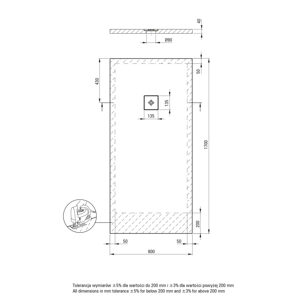 - SOLID PLUS-Technologie – Verbundstofffüllung, Möglichkeit zum Zuschneiden der Duschwanne im auf der Zeichnung markierten Bereich