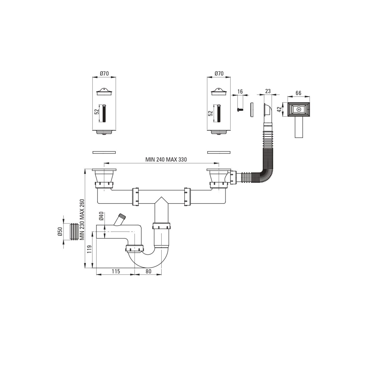 Der Siphon ist für 2-Kammer-Spülbecken aus Stahl vorgesehen. Dieses Modell verfügt über einen manuellen Stöpsel und einen rechteckigen Überlauf.