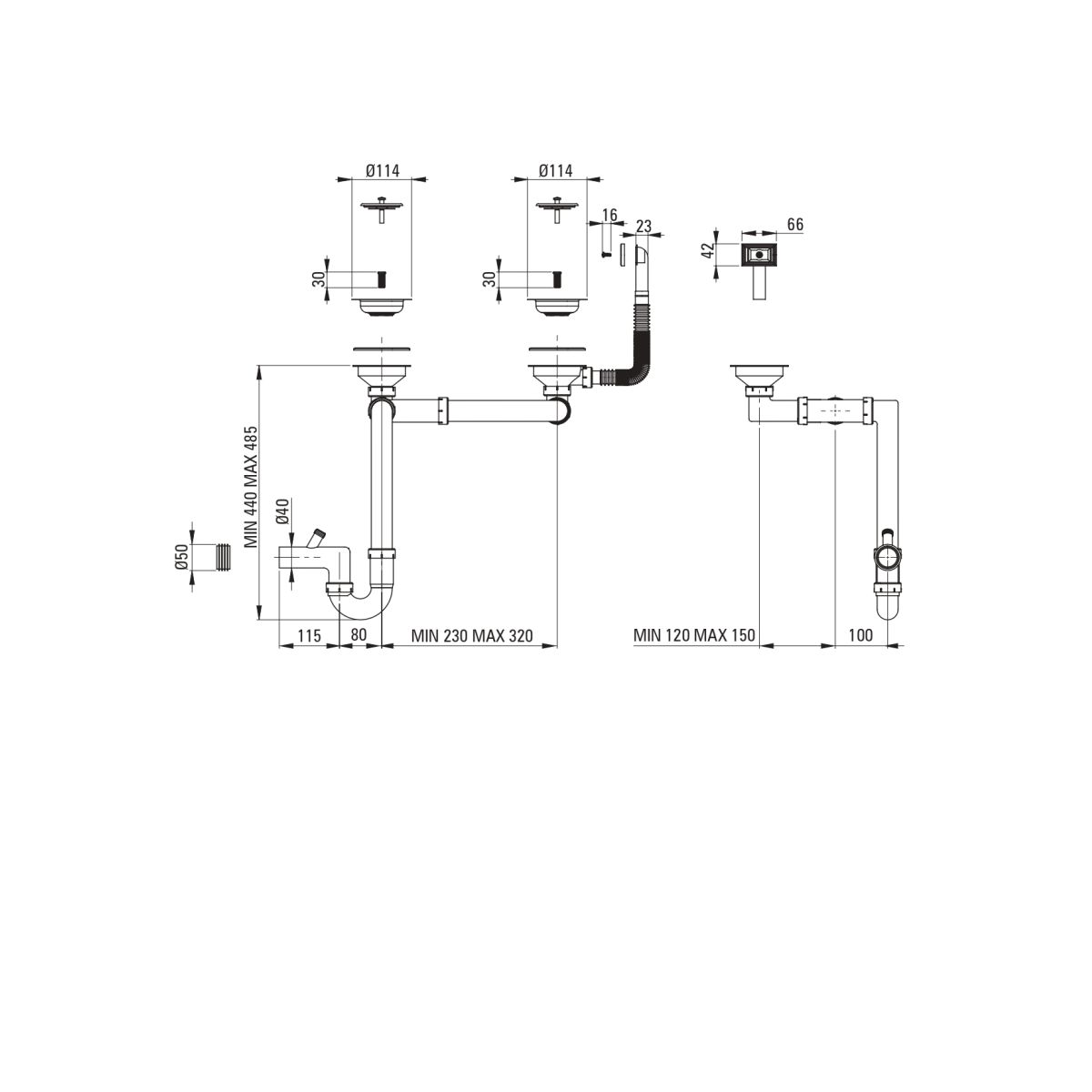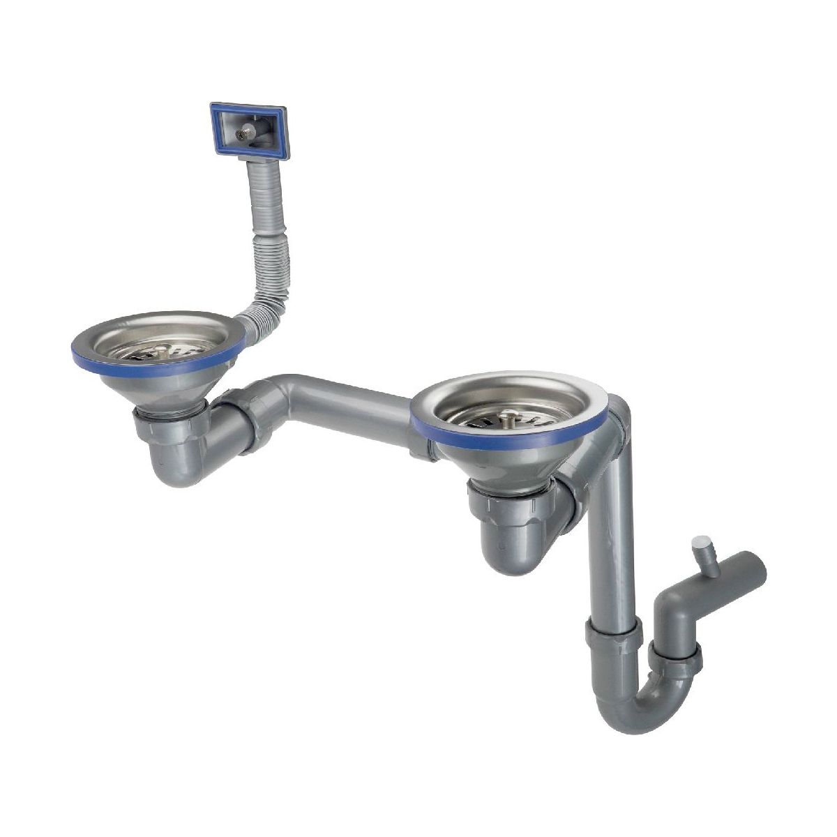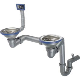 Siphon für Einbauspülen aus Stahl mit 1,5 und 2 Kammern. Der Siphon verfügt über einen rechteckigen Überlauf und einen manuellen Stopfen. Es handelt sich um ein Space-Saver-Modell, mit dem Sie wertvollen Platz im Schrank sparen.