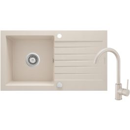 Die Granitspüle mit Wasserhahn ist eine einzigartige Kombination aus hoher Funktionalität und schönem Aussehen. Das warme Beige hellt jede Küche perfekt auf und passt sowohl zu traditionellen als auch zu modernen Innenräumen. Das Produkt wird aus einem natürlichen Granitverbundstoff von höchster Qualität hergestellt, die durch zahlreiche Tests von Deante-Experten bestätigt wurde. Dieses Material zeichnet sich durch eine hohe Beständigkeit gegen Verfärbungen, Temperaturschocks, Stöße und Feuchtigkeit gemäß der europäischen Norm PN-EN 13310 aus. Im Set ist auch eine Armatur im gleichen Farbton enthalten, die zusammen ein harmonisches Ganzes bildet. Der komfortable Auslauf ist mit einem Belüfter ausgestattet, der den Wasserstrahl mit Luft anreichert. Dadurch wird der Durchfluss deutlich reduziert, was Wasserverschwendung verhindert, ohne den Komfort beim Spülen zu beeinträchtigen. Eine Granitspüle mit Armatur ist eine Investition in hervorragende Haltbarkeit.