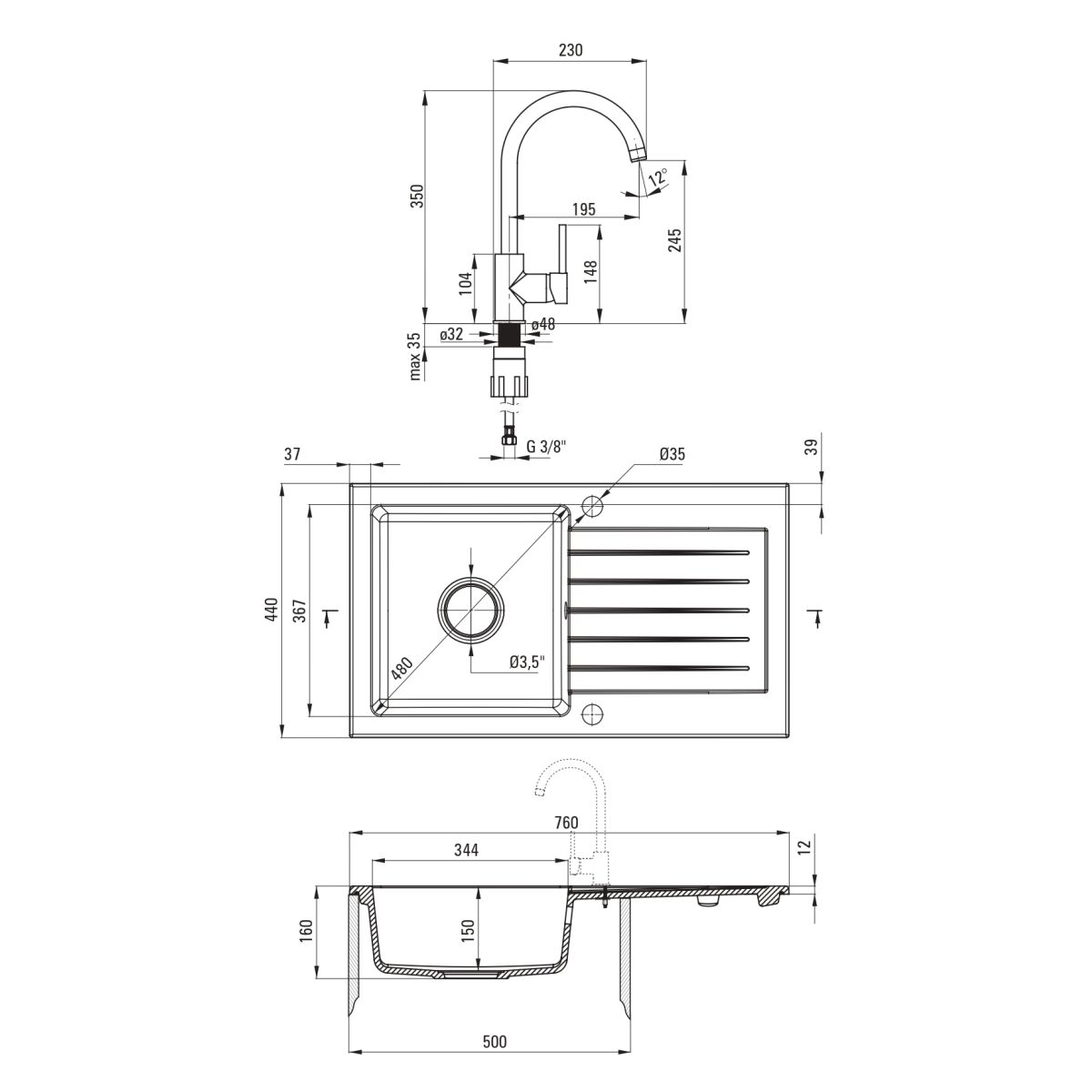 - Durchmesser des Abflusses: 3,5"