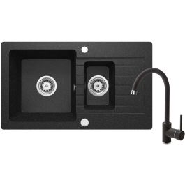 Die Granitspüle Zorba mit 1,5 Kammern, einer geräumigen und einer kleineren, rechtwinkligen Kammer mit Abtropffläche, ist ein Produkt, das sich perfekt in minimalistischen oder skandinavischen Kücheneinrichtungen präsentiert. Die elegante, graphitfarbene Optik bildet einen effektvollen Kontrast zu hellen Arbeitsplatten aus Stein oder Verbundwerkstoffen oder fügt sich perfekt in eine schwarze Umgebung ein und sorgt für einen stilvollen, monochromen Effekt, während der metallische Glanz der Aluminiumpartikel einen Hauch von Extravaganz verleiht. Zum Set gehört auch eine auffällige Spültischarmatur mit erhöhtem Körper und einem U-förmigen Auslauf in passender graphitfarbener Ausführung, die den minimalistischen Charakter des Designs unterstreicht. Die hier vorgestellte Spüle ist aus Granit gefertigt und zeichnet sich durch alle Vorteile aus, die für dieses extrem harte und widerstandsfähige Material typisch sind. Dazu gehören Beständigkeit gegen Verfärbungen, Kratzer, Temperaturschocks, Temperaturen bis 250 °C und Stöße. Darüber hinaus sind die Spülbecken aus dieser Kollektion wasserabweisend, was bedeutet, dass ihre Oberfläche Wasserpartikel nicht nur nicht durchlässt, sondern auch abweist, wodurch sie viel leichter sauber zu halten sind.