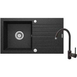 Die Granitspüle Zorba mit einem geräumigen, rechteckigen Becken und einem großen, praktischen Abtropffeld ist ein Produkt, das sich perfekt in minimalistische oder skandinavische Kücheneinrichtungen einfügt. Die elegante, graphitfarbene Oberfläche bildet einen effektvollen Kontrast zu einer hellen Arbeitsplatte aus Stein oder Verbundwerkstoff oder fügt sich perfekt in eine schwarze Umgebung ein und sorgt für einen stilvollen, monochromen Effekt, während der metallische Glanz der Aluminiumpartikel einen Hauch von Extravaganz verleiht. Zum Set gehört auch eine auffällige Spültischarmatur mit erhöhtem Körper und einem U-förmigen Auslauf in passender graphitfarbener Ausführung, die den minimalistischen Charakter des Designs unterstreicht. Die hier vorgestellte Spüle ist aus Granit gefertigt und zeichnet sich durch alle Vorteile aus, die für dieses extrem harte und widerstandsfähige Material typisch sind. Dazu gehören Beständigkeit gegen Verfärbungen, Kratzer, Temperaturschocks, Temperaturen von bis zu 250 Grad sowie Stöße. Darüber hinaus sind die Spülbecken aus dieser Kollektion wasserabweisend, was bedeutet, dass ihre Oberfläche nicht nur keine Wassermoleküle durchlässt, sondern diese auch abweist, wodurch sie viel leichter sauber zu halten sind.