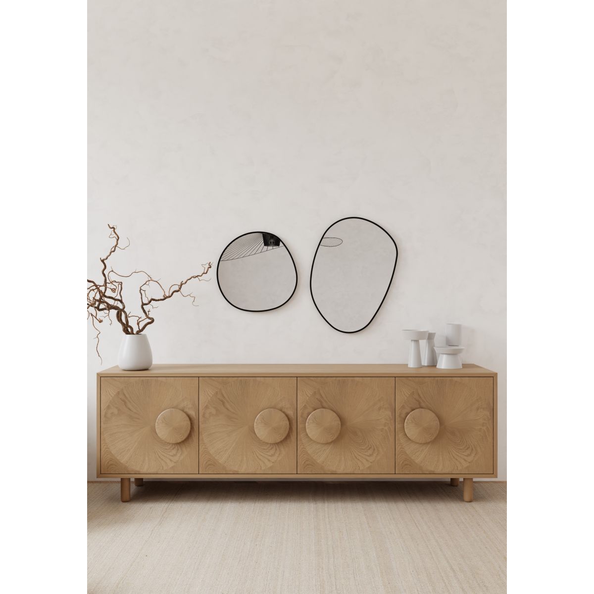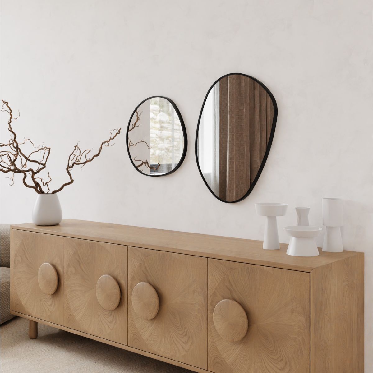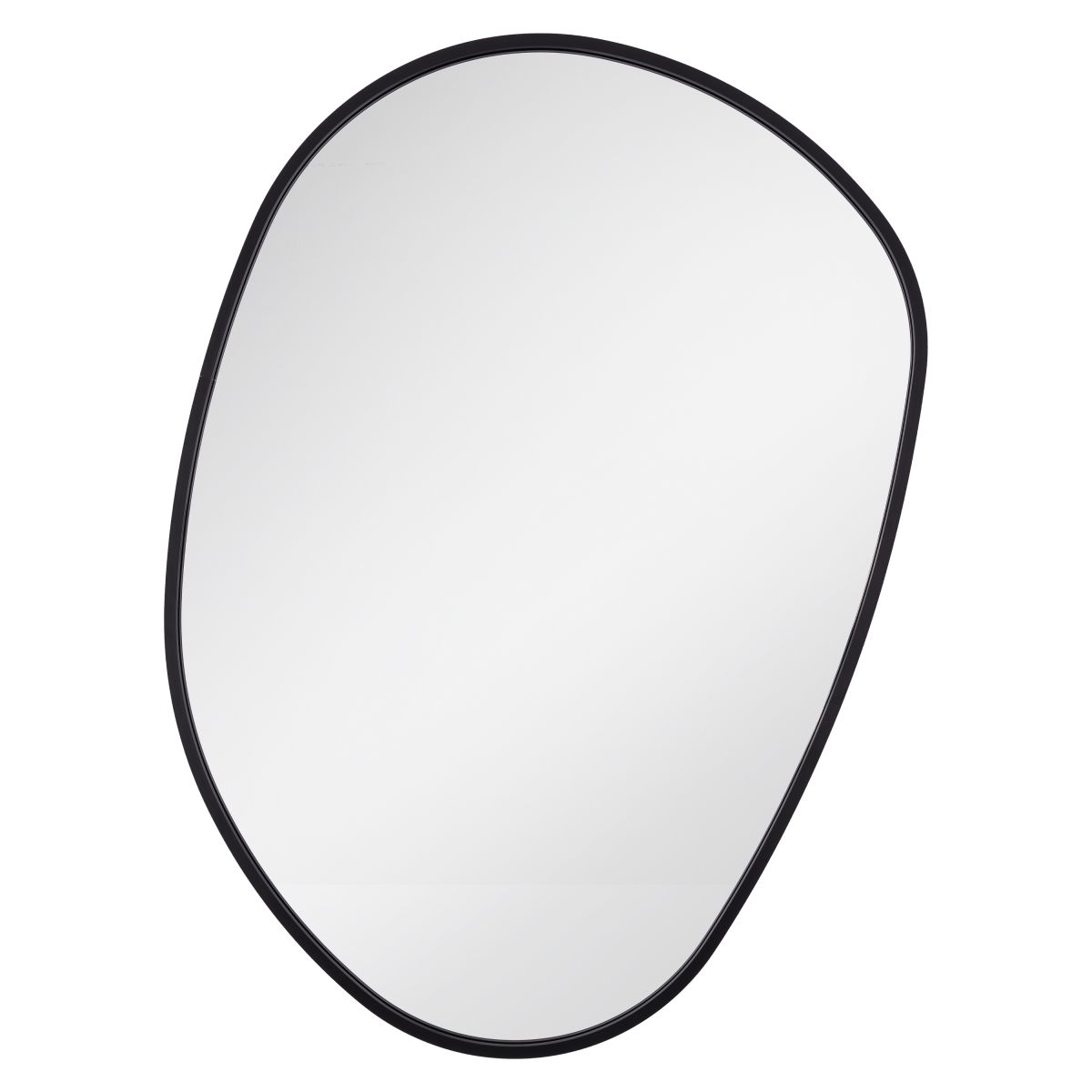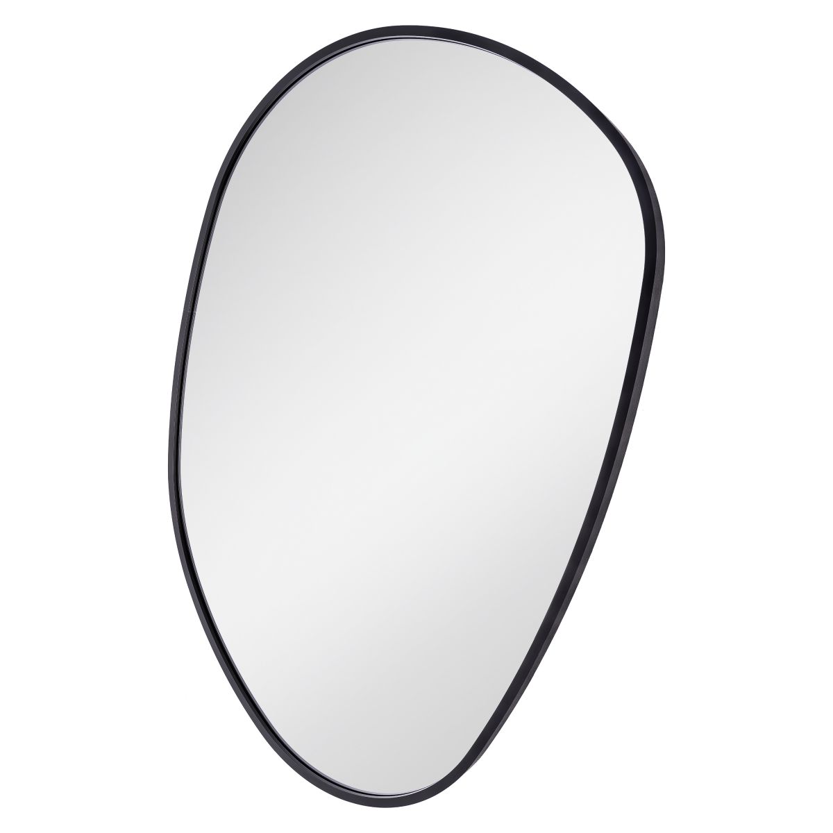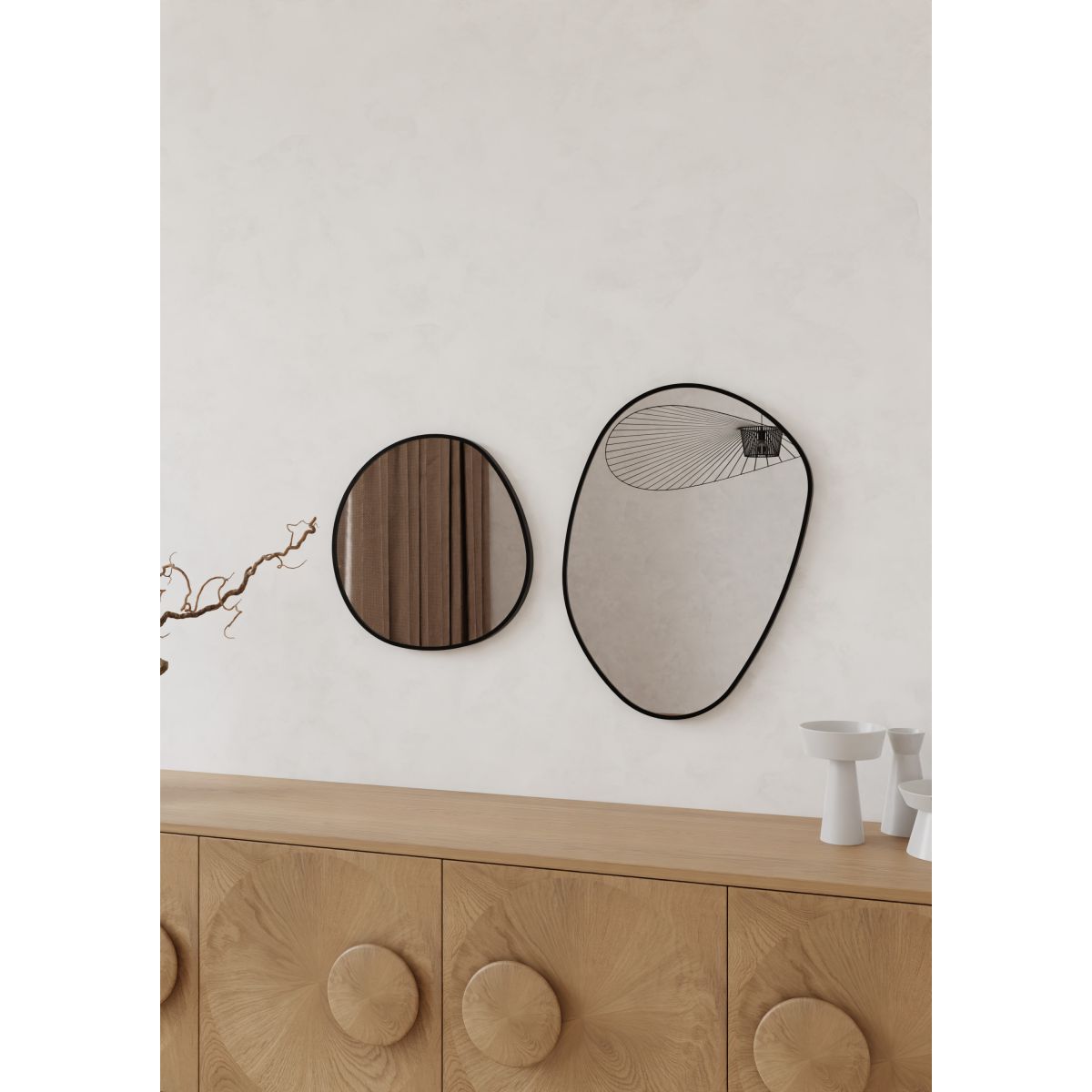 Spiegel mit unregelmäßiger Form in einem schwarzen Rahmen aus gebürstetem Aluminium. Rahmentiefe – 2,3 cm. Der Spiegel kann vertikal oder horizontal aufgehängt werden.