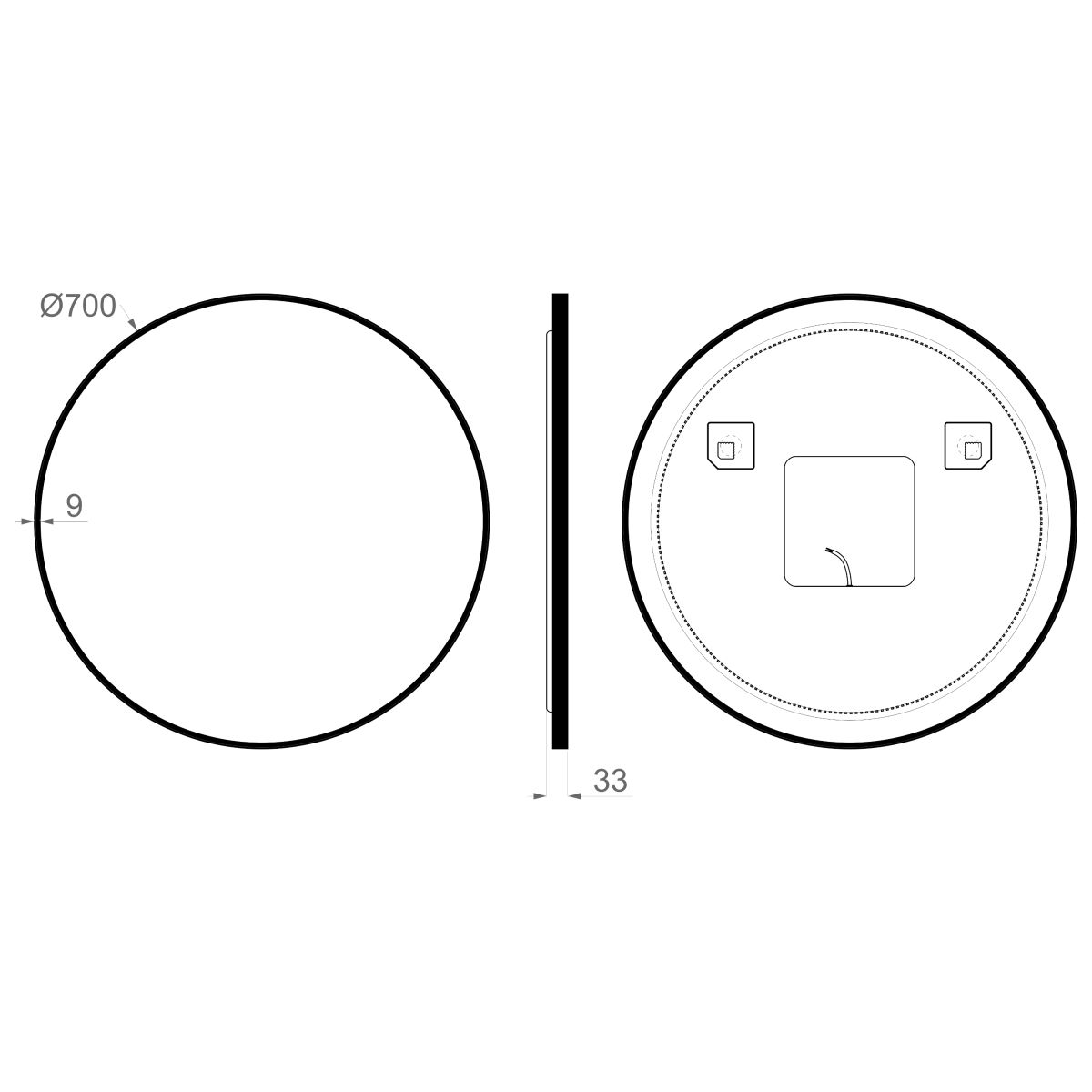 Spiegel in einem schwarzen Rahmen aus gebürstetem Aluminium. Rahmentiefe – 2,3 cm. Der Spiegel ist von hinten mit LEDs beleuchtet.