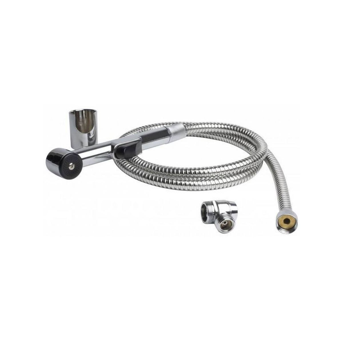 Dusch- und Bidet-Set. Das Set umfasst: hygienische Handbrause mit Wasserzufuhrknopf; T-Stück; PVC-Schlauch 1,5 m, 1/2" Durchmesser, Wandhalterung. Farbe: Chrom 172-90