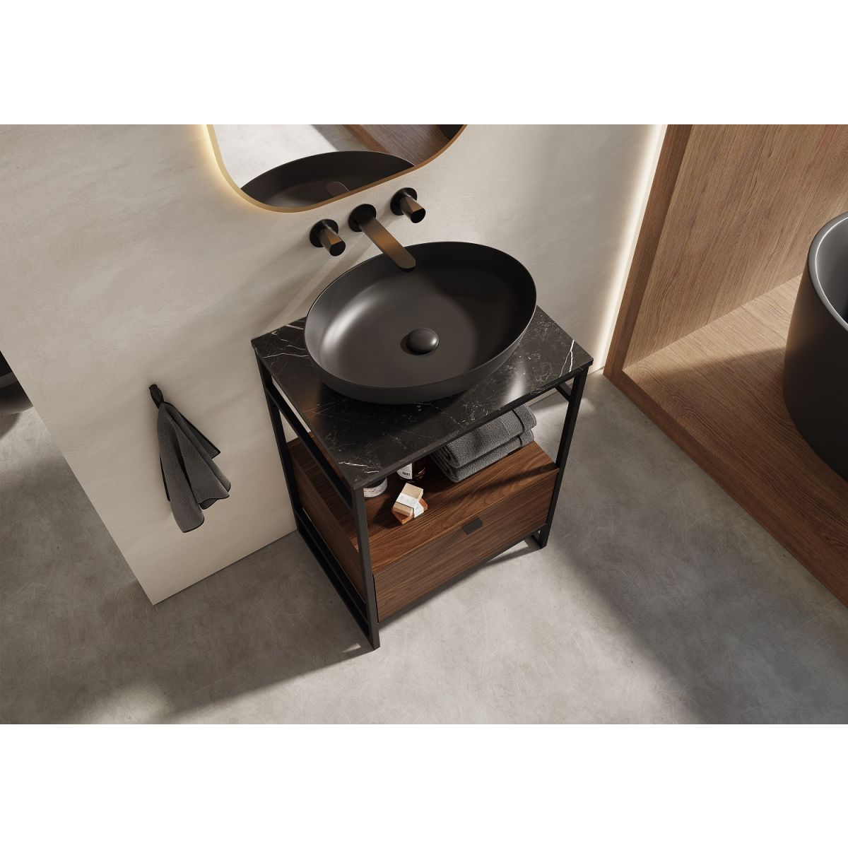 Indus ist ein besonders raffiniertes Symbol für Geschmack, Freiheit und künstlerische Ambitionen in der Innenraumgestaltung. Die Kombination aus hochwertigen Materialien und subtil kontrastierenden Oberflächen überrascht durch ihre hohe Funktionalität. Die Elemente der Kollektion unterstreichen die Silhouette aller Kompositionen – darunter ein Schrank mit Schublade oder Regal, kombiniert mit einer Arbeitsplatte oder Konsole und einer Wandverkleidung aus der Serie ElitStone unicolor. Das Innere der Indus-Schublade ist elegant in Anthrazit gehalten, und der Griff ist so angebracht, dass sich der Schrank leicht öffnen und schließen lässt.