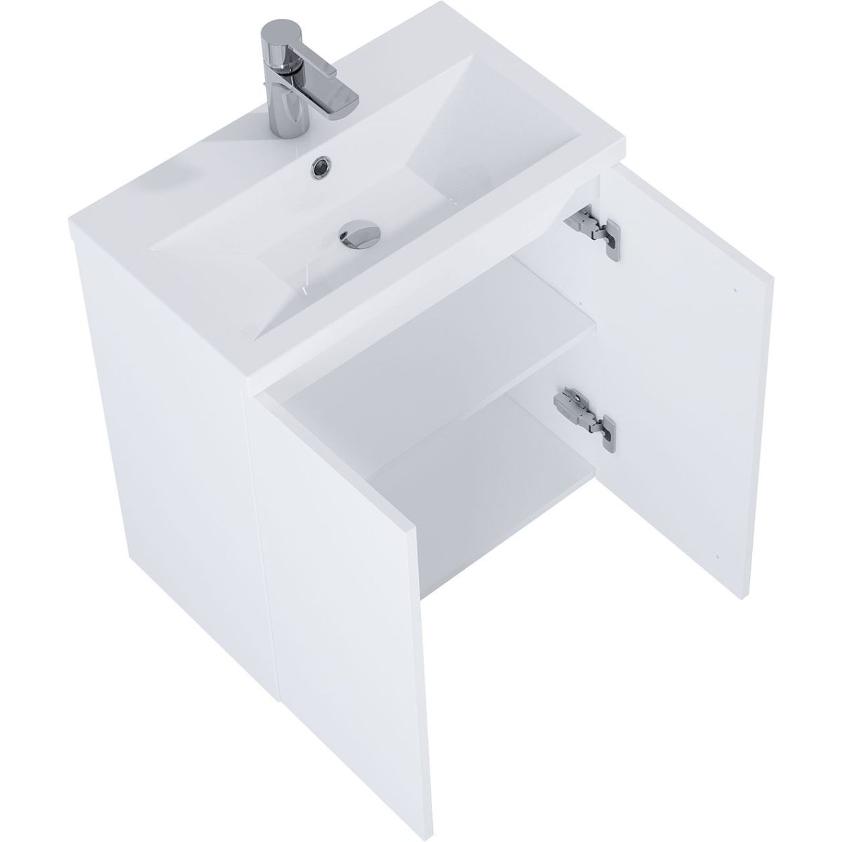Set Kido 60 cm mit 2 Türen, ausgestattet mit 1 höhenverstellbaren Einlegeboden. Hergestellt aus hochwertigen Materialien, Front und Korpus aus lackierter Platte in mattweiß, Beschläge mit leiser, sanfter Selbsteinzugsfunktion.