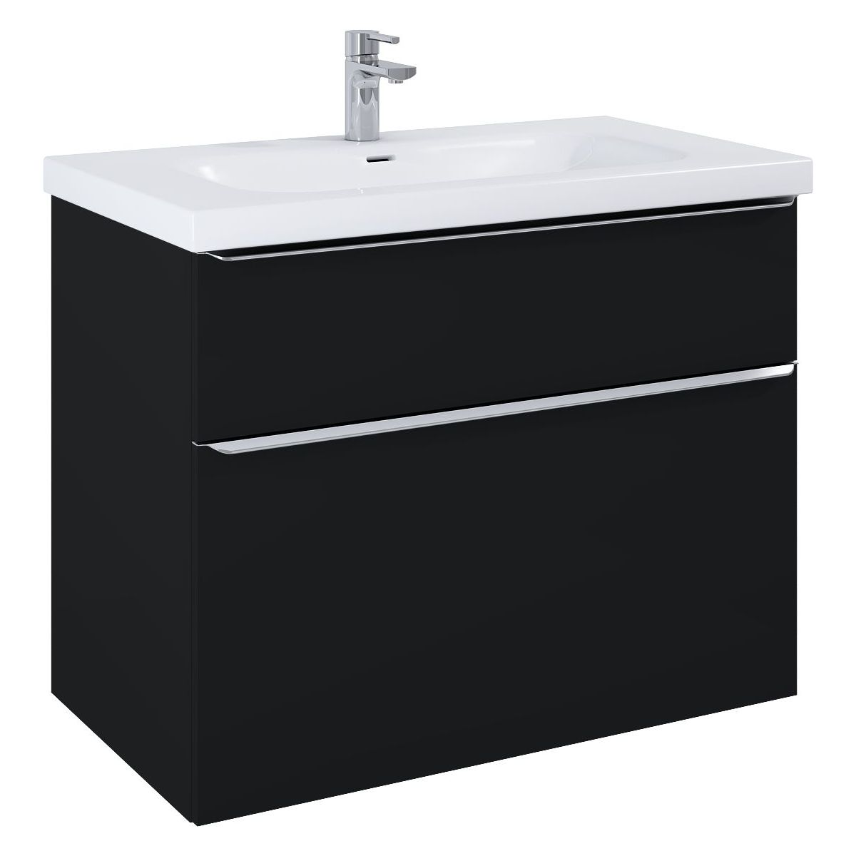 Waschbeckenunterschrank Lofty 90 cm, 2 Schubladen mit Soft-Close-Funktion und Vollauszug. Die erste Schublade ist mit einem Organizer ausgestattet. Der Schrank ist aus hochwertigen Materialien gefertigt, die Front und der Korpus bestehen aus laminierter Platte, lackiert in Schwarz matt.