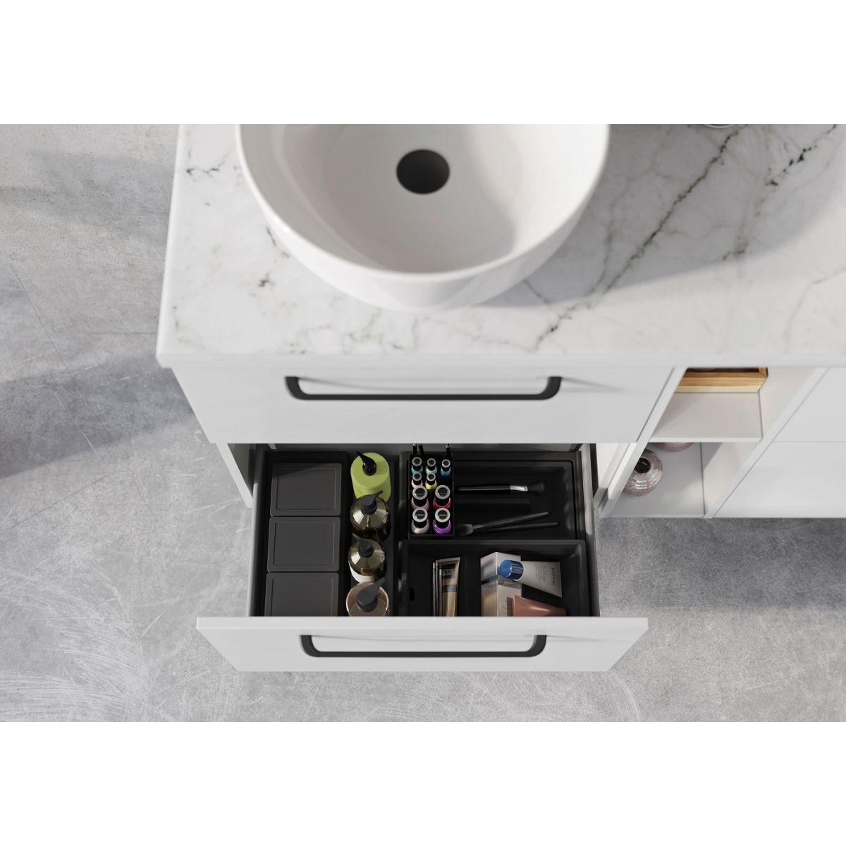 Das Aussehen unserer Badmöbel lässt sich dank der vielen Farben der Griffe aus verschiedenen Stilpaketen frei gestalten. Die Griffe ermöglichen es Ihnen, ein nicht überwältigendes Interieur mit individuellem und einzigartigem Charakter zu schaffen, das Ihren eigenen Bedürfnissen entspricht. Der klassische Zweipunktgriff Organic verleiht den Möbeln ein elegantes und harmonisches Finish.