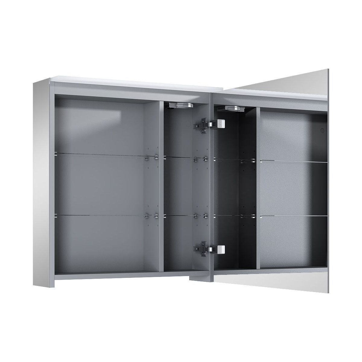 Hängeschrank 60 cm mit doppelseitiger Spiegelfront und verspiegelten Kanten und Seiten. Der Schrank ist mit 2 höhenverstellbaren Glasböden und einer Technobox ausgestattet. Hergestellt aus hochwertigen Materialien, Grass-Scharniere mit Soft-Close-Funktion. Das Innere des Schranks ist in elegantem Grau gehalten. Der Schrank ist mit einer LED-Leiste ausgestattet, Lichtfarbe neutral 4000 K.