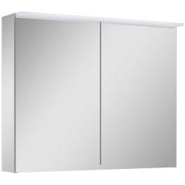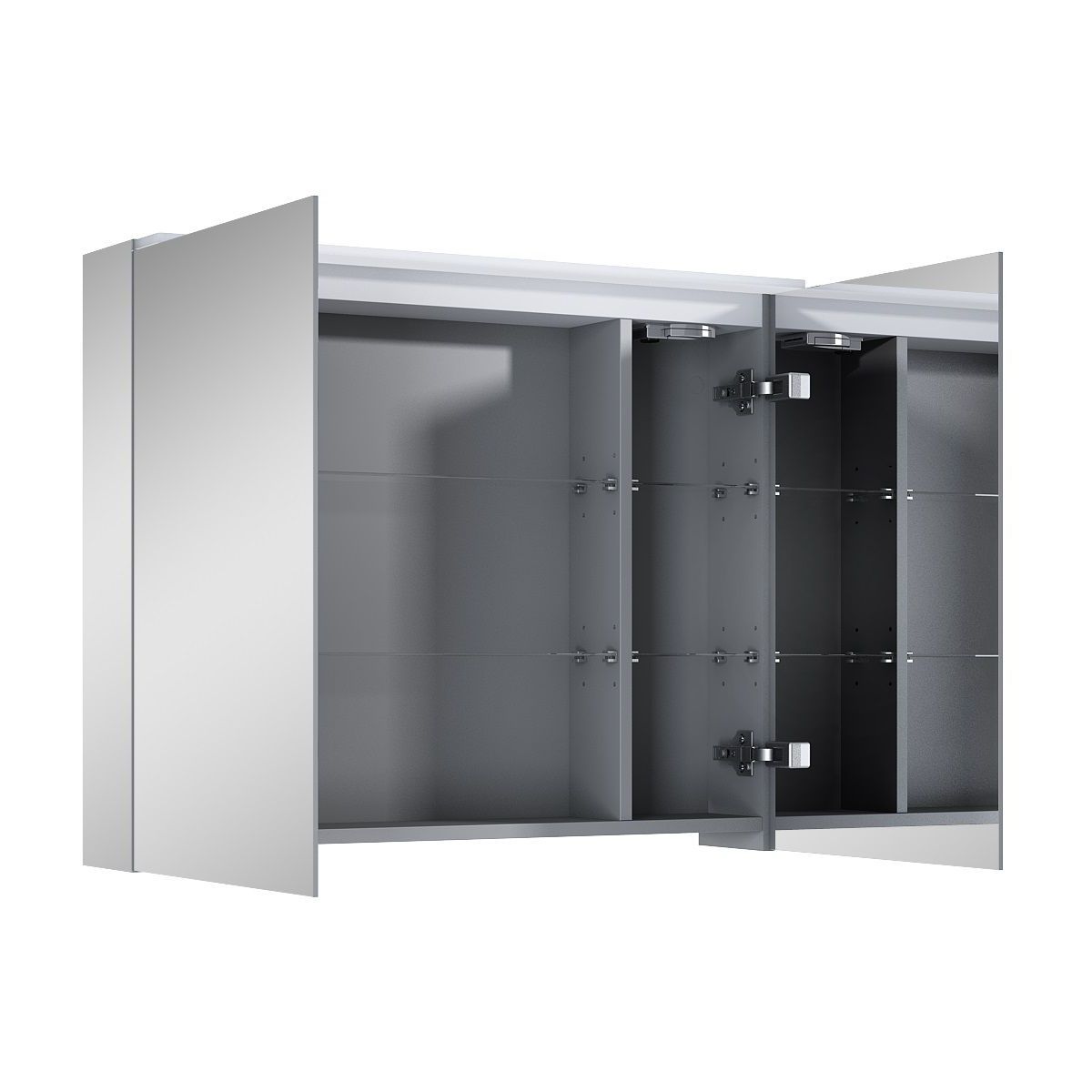 Hängeschrank 80 cm mit doppelseitiger Spiegelfront und Spiegelkanten und -seiten. Der Schrank ist mit 4 höhenverstellbaren Glasböden und einer Technobox ausgestattet. Hergestellt aus hochwertigen Materialien, Grass-Scharniere mit Soft-Close-Funktion. Das Innere des Schranks ist in elegantem Grau gehalten. Der Schrank ist mit einer LED-Leiste ausgestattet, Lichtfarbe neutral 4000 K.
