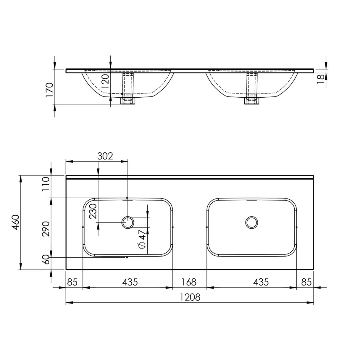 Keramik-Waschbecken Skappa 120 cm Duo in der Farbe Weiß. Das Waschbecken wird auf traditionelle Weise hergestellt und zeichnet sich durch hohe Festigkeit, Abriebfestigkeit und Beständigkeit gegen chemische Einflüsse aus. Waschbecken mit Überlauf, ohne Loch für die Armatur. Entwickelt für Unterputzarmaturen.