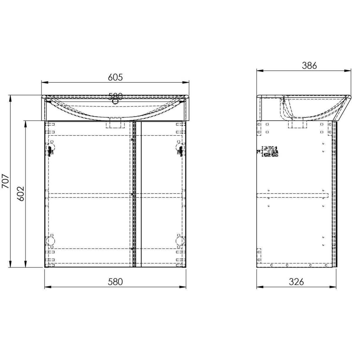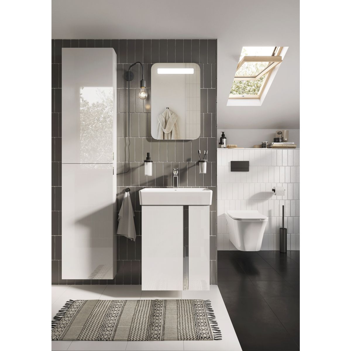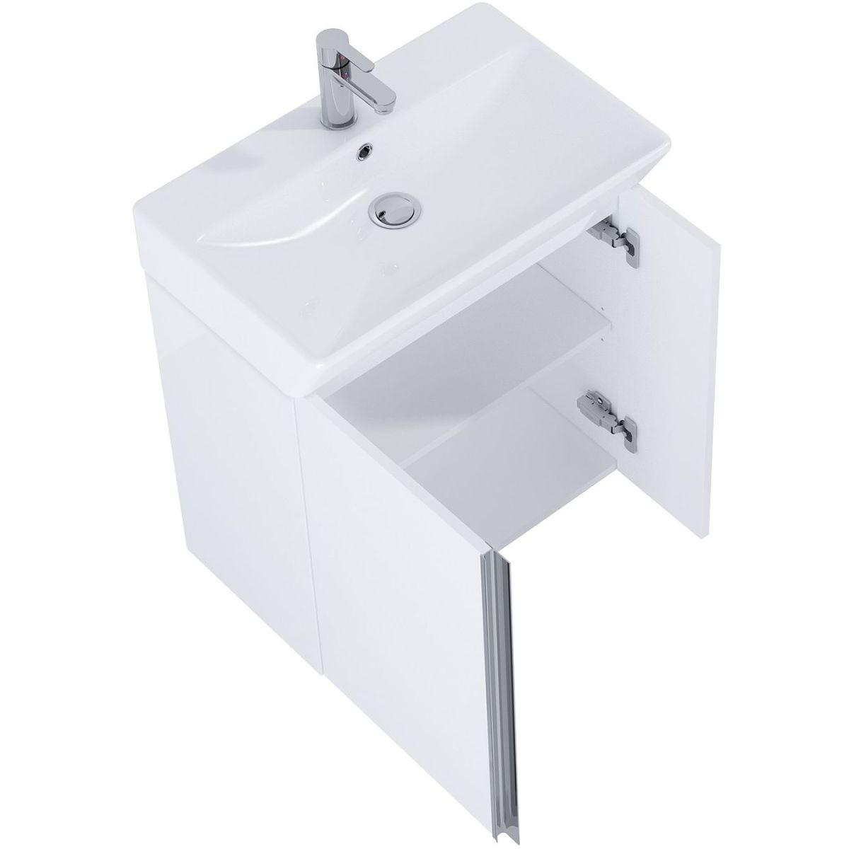 Das Set Skye 60 cm ist mit asymmetrischen Türen mit Soft-Close-System und einem höhenverstellbaren Regal ausgestattet. Das Set ist aus hochwertigen Materialien gefertigt, die Front und der Korpus bestehen aus hochglanzlackierten Platten in Weiß. Der verchromte Metallgriff ist vertikal über die gesamte Höhe des Schranks angebracht. Das Set besteht aus einem Waschtischunterschrank und einem Waschbecken mit elegant geformter Schale. Das Set passt perfekt zu den Schränken aus der Kollektion For All.