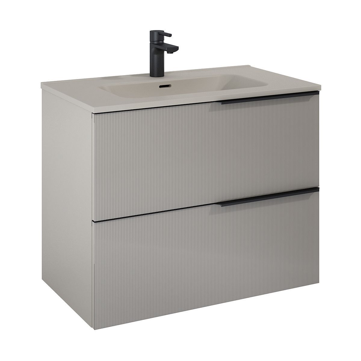 Die vom Großstadtstil inspirierte Kollektion SOHO ist ein avantgardistisches Angebot für moderne und stilvolle Badezimmer. Die geriffelten Glasfronten verleihen den Möbeln ein außergewöhnliches Aussehen, sorgen für Abwechslung und schmücken den Raum. Hinter den auffälligen Fronten verbergen sich zwei Schubladen mit Metallseiten in anthrazitfarbener Ausführung. Der rechtsseitige, perfekt geformte Griff ergänzt das Profil des Schranks ideal.