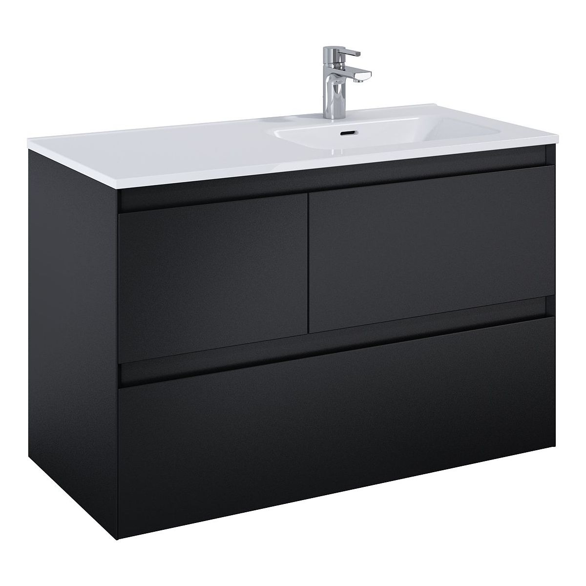 Waschbeckenunterschrank Split 100 cm, 3 Schubladen mit Metallseiten, mit Vollauszug und Soft-Close-System. Die oberen Schubladen sind asymmetrisch aufgeteilt – die größere (60 cm) befindet sich auf der rechten Seite. Der Schrank ist aus hochwertigen Materialien gefertigt, die Front und der Korpus bestehen aus laminierten Platten, lackiert in Schwarz matt. Gefräste Griffe, im Winkel von 45° profiliert. Der Schrank ist für die Kombination mit ElitStone-Arbeitsplatten geeignet.