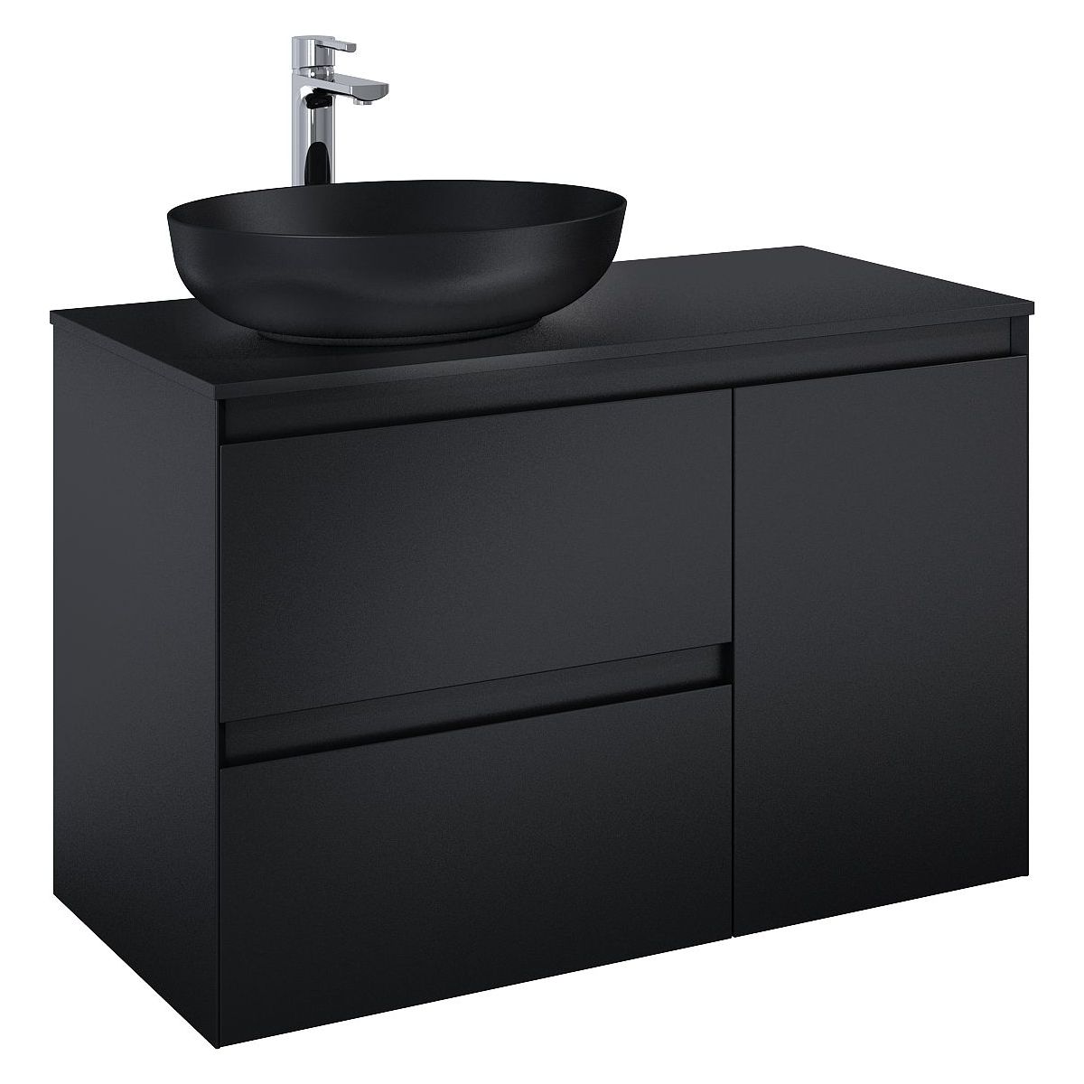 Der Waschtischunterschrank Split 100 besteht aus einem Waschtischunterschrank 60 und einer Kommode 40 mit Cargo-Korb auf der rechten Seite. Waschtischunterschrank mit 2 Schubladen mit Metallseiten, Vollauszug und Soft-Close-System. Der Cargo-Korb in der Kommode verfügt über robuste Führungen mit einer Tragkraft von bis zu 20 kg, Vollauszug und Soft-Close-System. Der Schrank ist aus hochwertigen Materialien gefertigt, die Front und der Korpus bestehen aus laminierter Platte, lackiert in Schwarz matt. Gefräste Griffe, im 45°-Winkel profiliert. Der Schrank ist für die Kombination mit ElitStone-Arbeitsplatten geeignet.