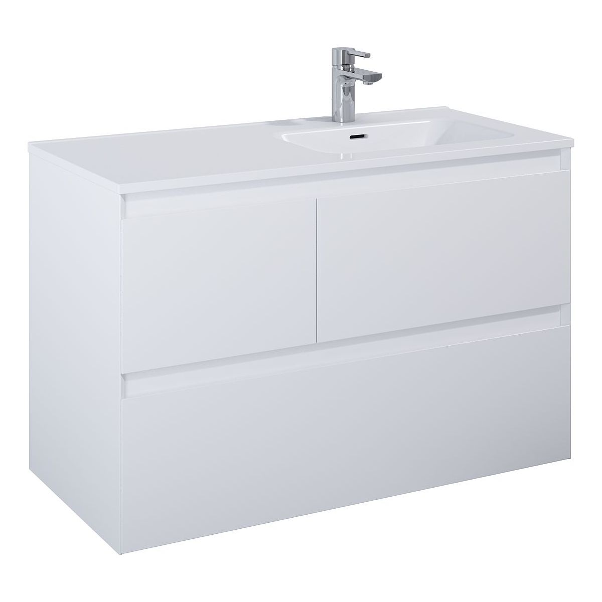 Waschbeckenunterschrank Split 100 cm, 3 Schubladen mit Metallseiten, mit Vollauszug und Soft-Close-System. Die oberen Schubladen sind asymmetrisch aufgeteilt – die größere (60 cm) befindet sich auf der rechten Seite. Der Schrank ist aus hochwertigen Materialien gefertigt, die Front und der Korpus bestehen aus laminierten Platten, lackiert in mattem Weiß. Die gefrästen Griffe sind in einem Winkel von 45° profiliert. Der Schrank ist für die Kombination mit ElitStone-Arbeitsplatten geeignet.