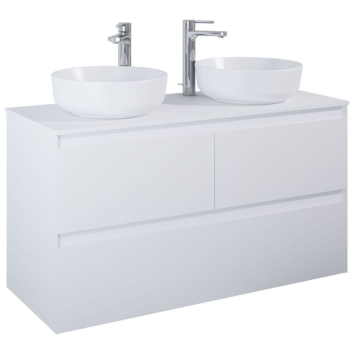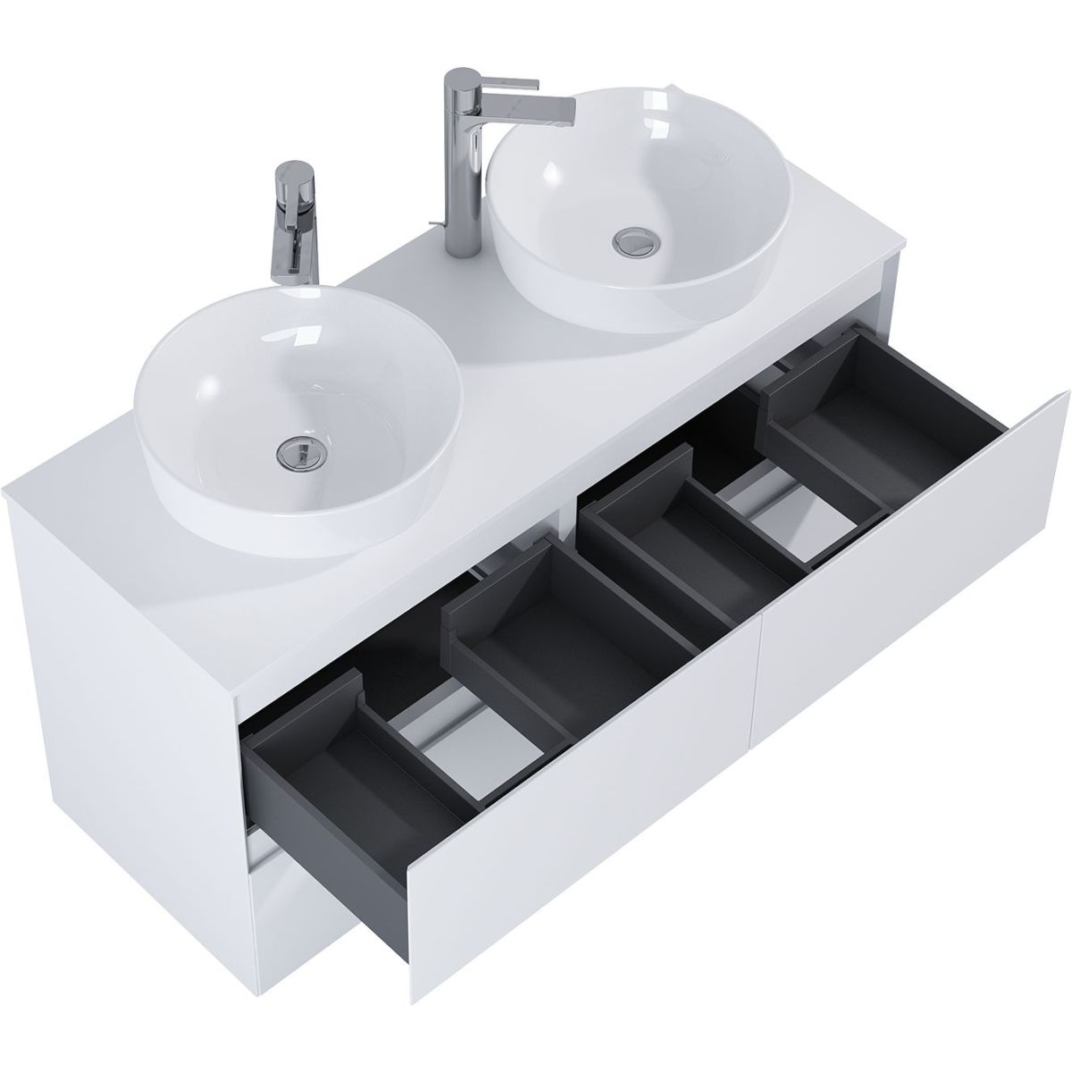 Waschbeckenunterschrank Split 120 cm, 3 Schubladen mit Metallseiten, mit Vollauszug und Soft-Close-System. Obere Schubladen mit gleichmäßiger Aufteilung. Der Schrank ist aus hochwertigen Materialien gefertigt, Front und Korpus aus laminierter Platte, lackiert in mattem Weiß. Gefräste Griffe, im 45°-Winkel profiliert. Der Schrank ist für die Kombination mit ElitStone-Waschtischplatten oder dem Keramikwaschbecken Maxi 120 Duo geeignet.
