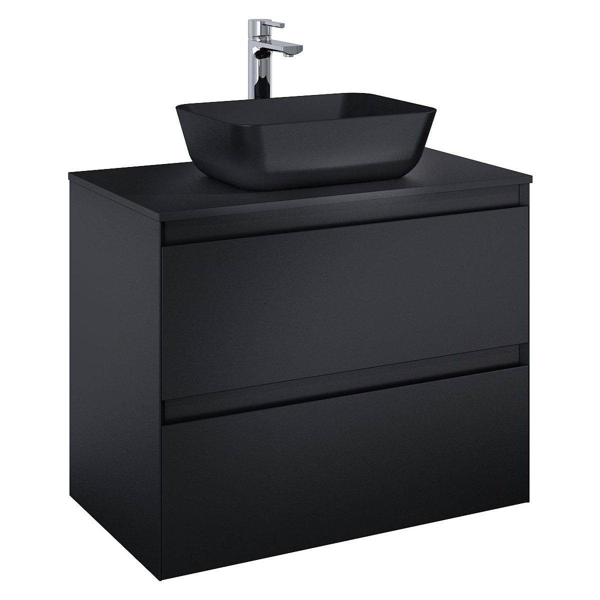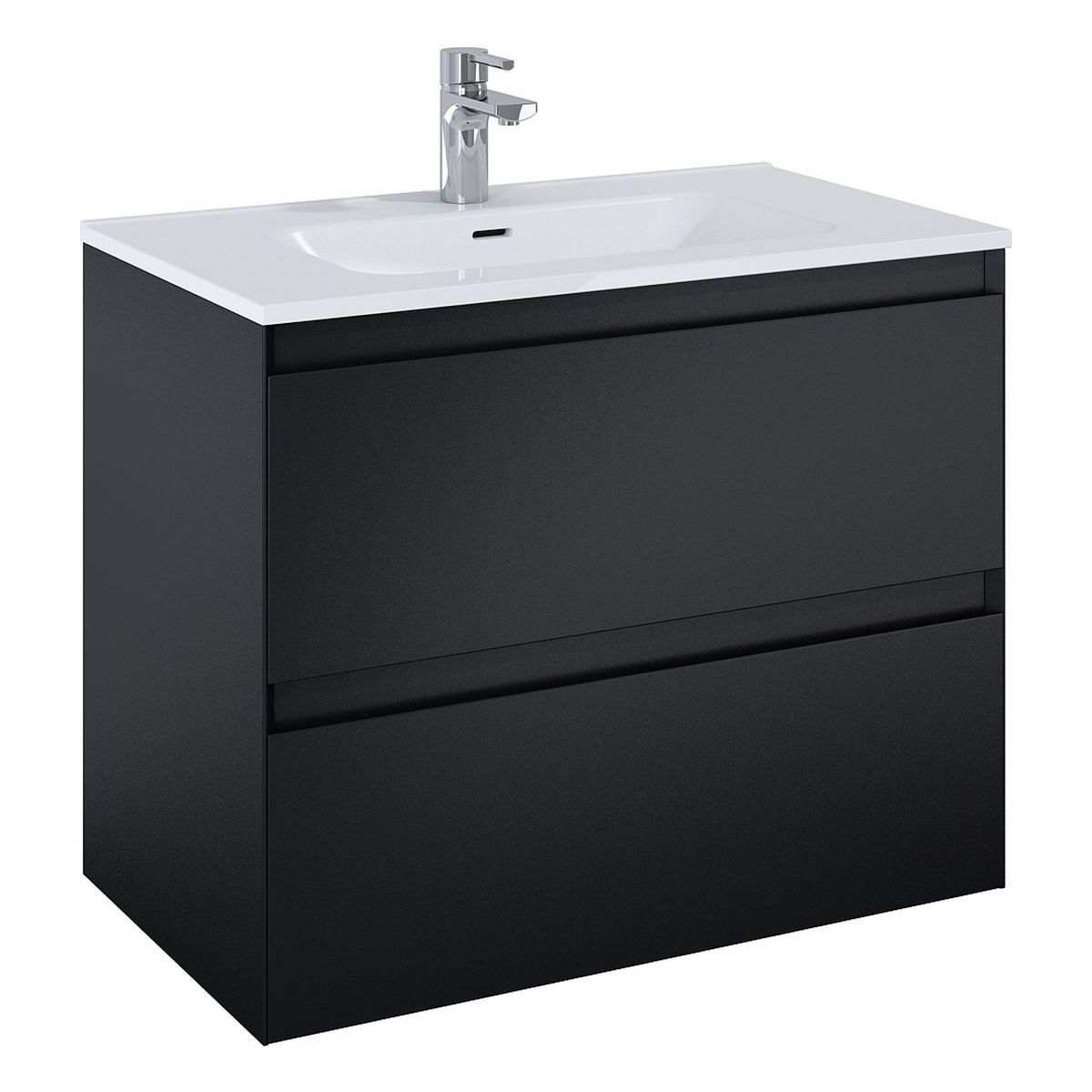 Waschbeckenunterschrank Split 80 cm, 2 Schubladen mit Metallseiten, mit Vollauszug und Soft-Close-System. Der Schrank ist aus hochwertigen Materialien gefertigt, die Front und der Korpus bestehen aus laminierter Platte, lackiert in Schwarz matt.