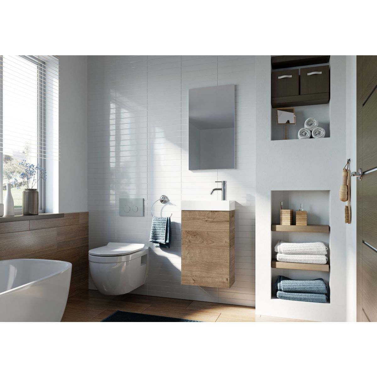 Young Basic ist eine perfekte Kombination aus minimalistischer Form und Funktionalität. Die leichte und zugleich robuste Konstruktion des Sets passt perfekt zu minimalistischen Badezimmern, und die Kraft der Schlichtheit des Möbels sorgt für eine ideale Anpassung an jedes Interieur.