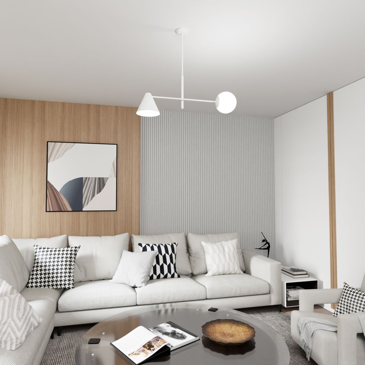 HERMES – Eine Kombination aus modernem Stil und der Strenge des industriellen Stils. Die Ausführung der Lampe präsentiert perfekt den Kontrast zwischen der Zartheit des Glases und der Härte und Kühle des Metalls. Die Verwendung von zwei Arten von Lampenschirmen und die etwas unregelmäßige Form machen die HERMES-Serie einzigartig und außergewöhnlich. Diese Leuchte spendet nicht nur Licht, sondern sieht auch toll aus und bereichert die Raumgestaltung. Wenn Sie ungewöhnliche Lösungen mögen, wird diese Lampe Ihre Erwartungen erfüllen. Sie ist die richtige Wahl für Menschen, die einen strengen, aber stilvollen Einrichtungsstil mögen. Es ist nicht nur eine gewöhnliche Lampe – sie ist ein starkes dekoratives Element, das Ihrem Raum Charakter verleiht. Die Metalllampenschirme können Sie in beliebiger Position einstellen. Die Serie ist in Schwarz und Weiß mit 2, 4 oder 6 Lichtpunkten erhältlich. Das Produkt ist zu 100 % polnisch und wurde mit Liebe zum Detail aus Materialien höchster Qualität hergestellt.