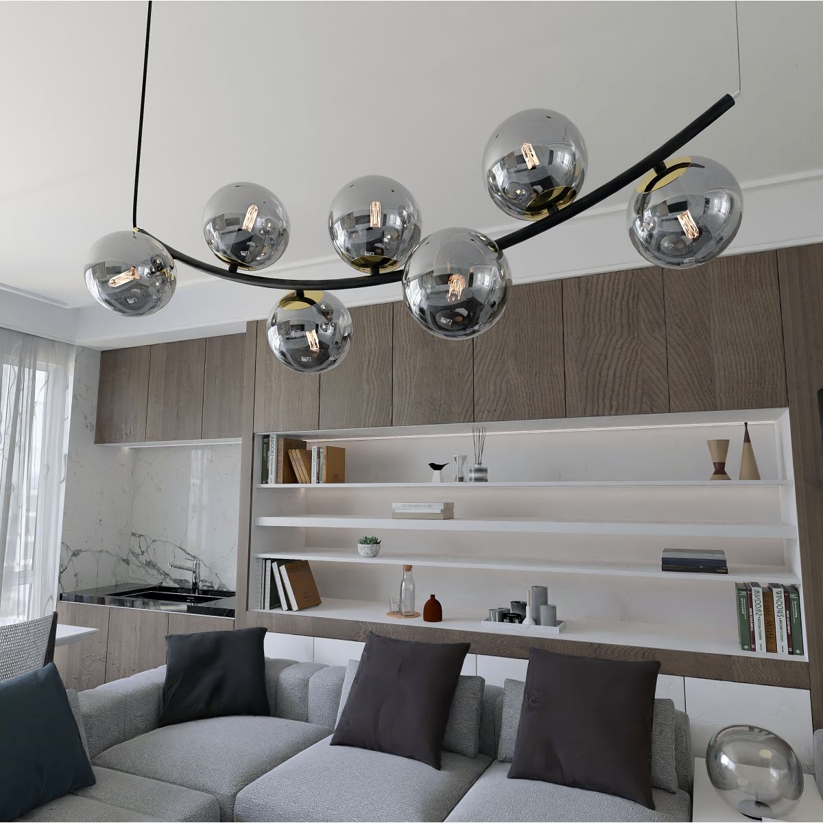 Bringen Sie mit der Hängelampe RITZ die Schlichtheit minimalistischen Designs in Ihr Interieur. Sie besteht aus schwarzem Stahl und passt perfekt zum graphitfarbenen Lampenschirm. Die halbkreisförmige Leuchte mit unregelmäßig angeordneten Lampenschirmen verleiht dem Interieur einen einzigartigen Charakter und unterstreicht seinen modernen und eleganten Stil. Diese Leuchte ist die perfekte Wahl für alle, die ihr Interieur beleben möchten, indem sie eine Beleuchtung schaffen, die sowohl funktional als auch ästhetisch ist. Hergestellt in Polen.