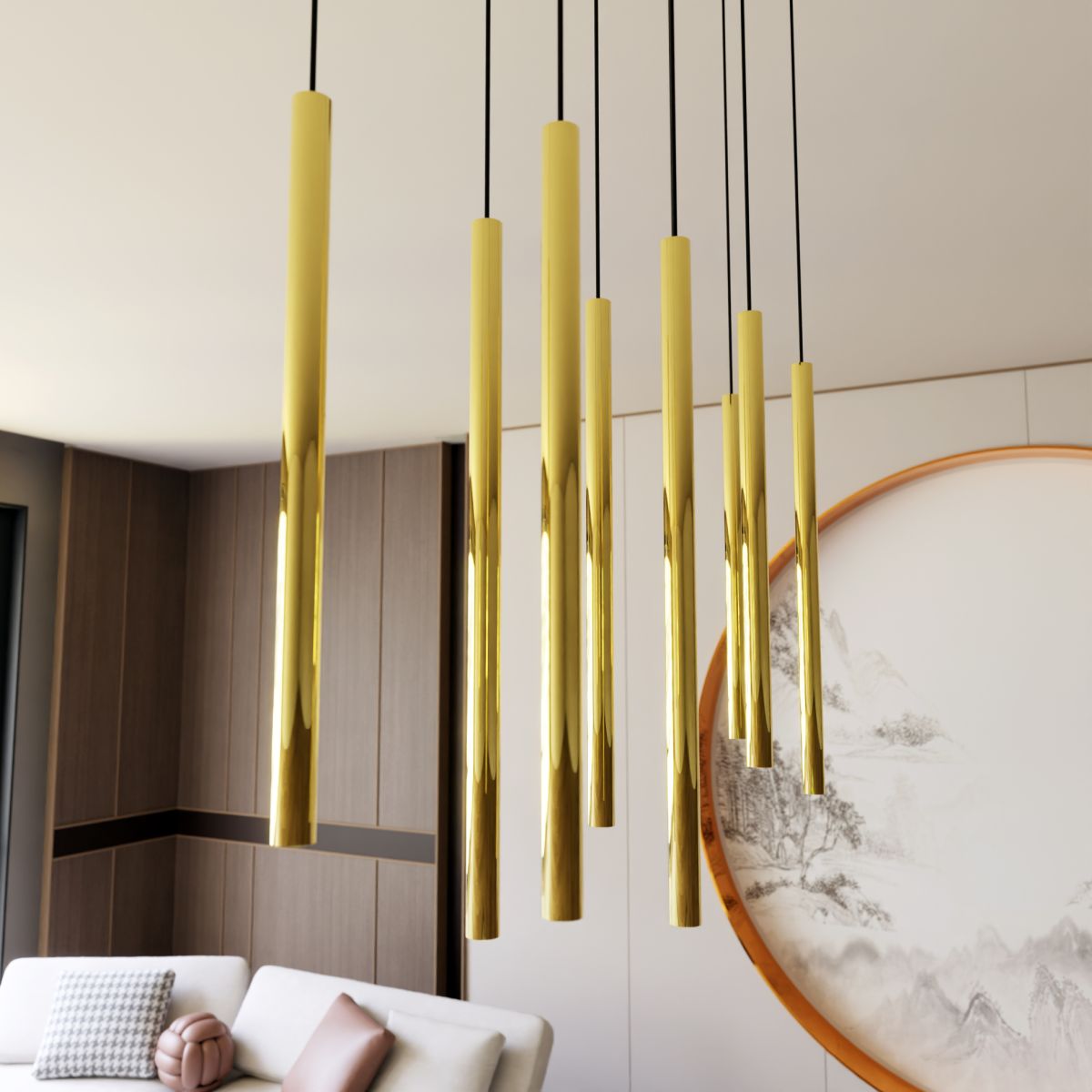 Die Hängeleuchten der Serie Selter verbinden Glamour mit modernem Design. Die goldenen Röhren, aus denen die Struktur der Leuchte besteht, verleihen ihr einen einzigartigen Glanz und Eleganz. Diese glänzenden Elemente machen die Leuchte nicht nur zu einer Lichtquelle, sondern auch zu einem luxuriösen Akzent in jedem Raum. Die Serie Selter ist die perfekte Wahl für alle, die ihrem Interieur raffinierten Charme und subtilen Glamour verleihen möchten.