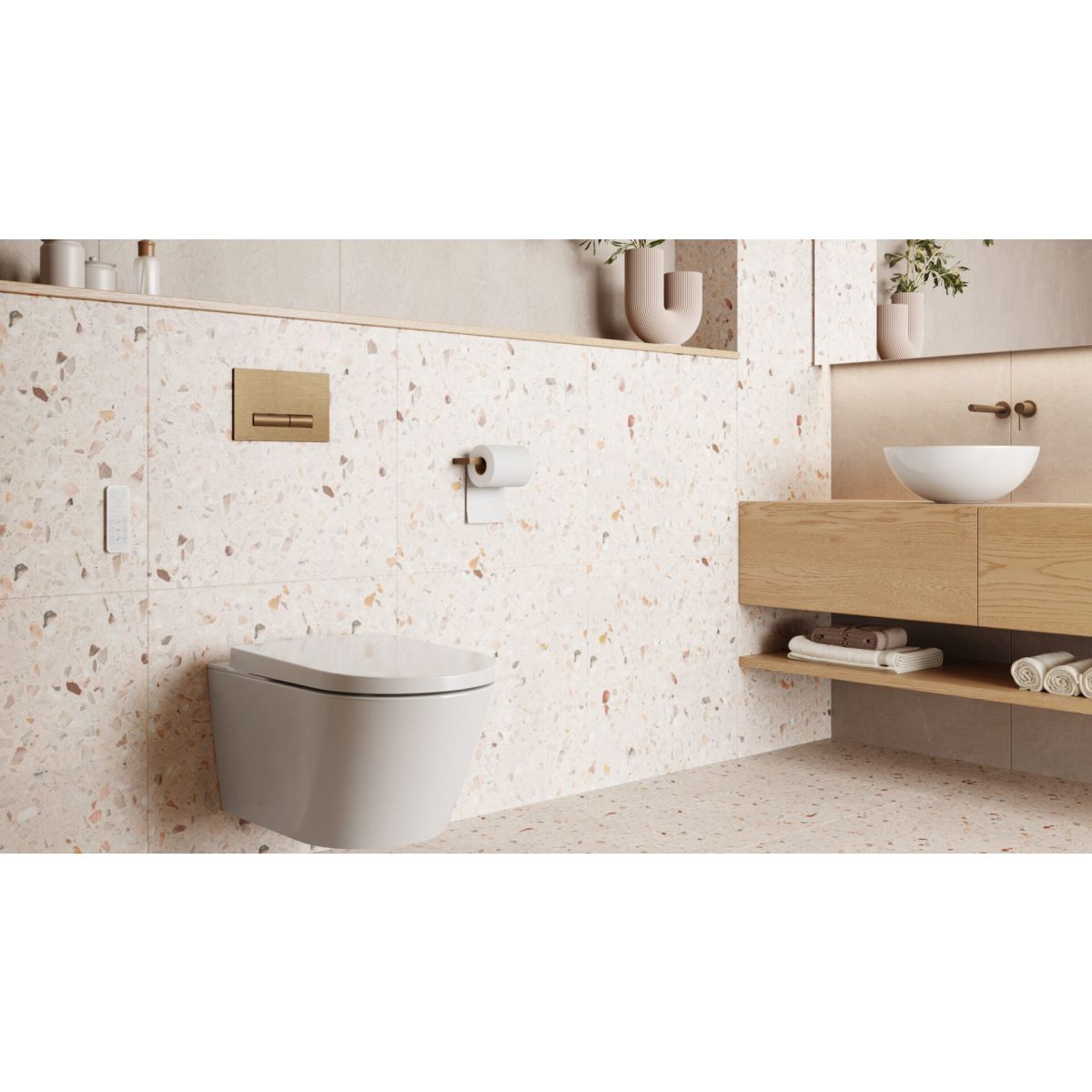 Aurro Fresh ist ein Spülknopf für die Toilette, für den Shiro Premium-Rahmen, mit mechanischem Spülsystem. Das Besondere an diesem Knopf ist der eingebaute Mechanismus mit einem Spender, der an den Schlauch im Shiro Premium-Rahmen angeschlossen wird. Damit lässt sich der Tank des Pure Power-Systems bequem mit einem Erfrischungsfluid befüllen, das Kalkablagerungen in der Toilettenschüssel verhindert. Bei jedem Spülvorgang gibt dieses System eine kleine Menge des Fluids in die Toilette ab. Der Erfrischungszusatz befindet sich immer in einem geschlossenen Kreislauf und ist nicht ständig mit dem Wasser im Spülkasten in Verbindung, im Gegensatz zu herkömmlichen Reinigungstabletten, die mit Wasser in Kontakt kommen. Dadurch wird das Risiko einer Beschädigung von Teilen des Spülkastens (insbesondere der Dichtungen) durch die Inhaltsstoffe des Mittels verringert. Aurro Fresh besteht aus Kunststoff und verfügt über zwei Tasten für die Spar- und Vollspülung, die durch Drücken von vorne betätigt werden. Die Tasten wurden so minimalistisch wie möglich gestaltet, sodass das gesamte Gehäuse nur 6 mm über die Fliese hinausragt. Das Modell ist in folgenden Farben erhältlich: Chrom, Weiß glänzend, Schwarz matt, Gold glänzend, Gold gebürstet und Kupfer gebürstet. Neu! Die Tasten in den gebürsteten Ausführungen Gold und Kupfer sind mit einer zusätzlichen Antifinger-Beschichtung versehen, die Fingerabdrücke auf der Oberfläche weniger sichtbar und leichter zu entfernen macht. Obwohl sich die Beschichtung natürlich abnutzen kann, hilft die richtige Pflege, ihre Wirksamkeit länger zu erhalten. Wie geht das? Am besten wischen Sie die Taste vorsichtig mit einem trockenen Mikrofasertuch ab oder verwenden Sie nur Wasser ohne Reinigungsmittel. Durch regelmäßige Pflege der Beschichtung bleibt das ästhetische Erscheinungsbild der Tasten lange erhalten.