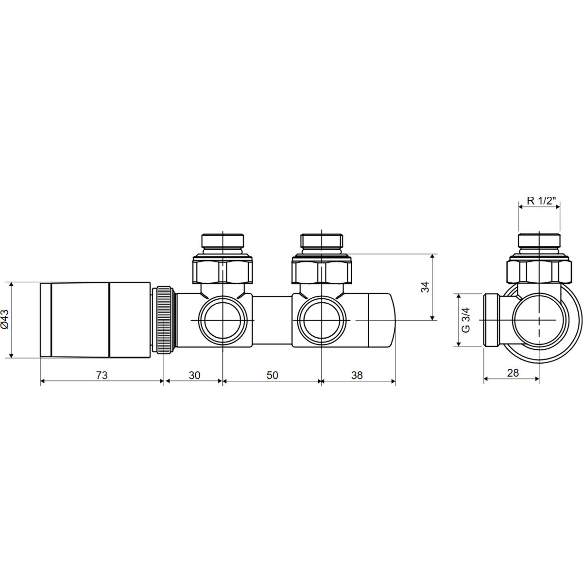Thermostat-Set Caldo mit unterem Anschluss mit einem Abstand von 50 mm. Es ermöglicht eine präzise Temperaturregelung und Durchflussregelung, was eine optimale Leistung des Heizsystems gewährleistet.