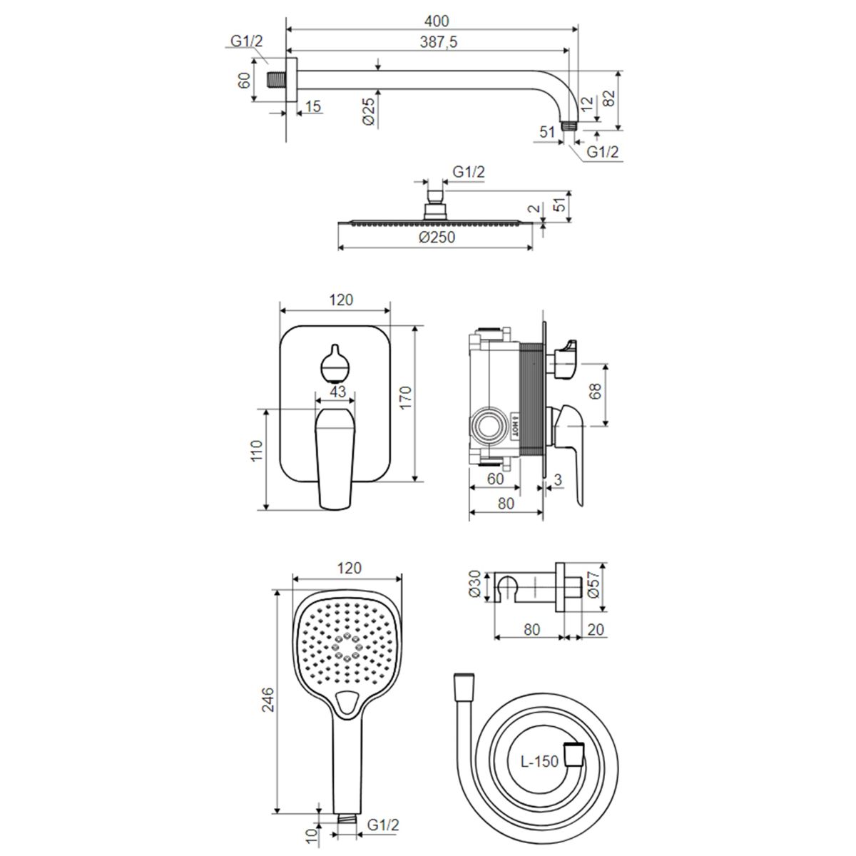 - Inbegriffen: Batterie mit Schalter, Duschkopf, Duschkopf, Duschschlauch, Duschhalter, Duscharm, Eckanschluss