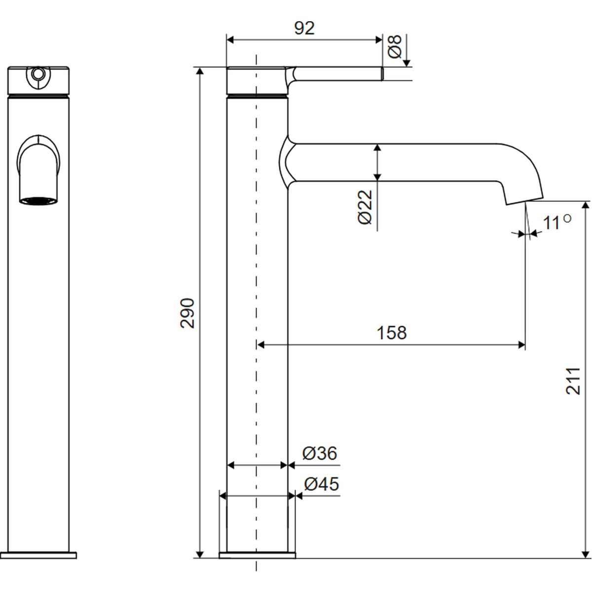 Die hohe Waschtischarmatur hat einen Auslauf mit einer Reichweite von 158 mm und einer Höhe von 290 mm. Dadurch kann sie erfolgreich für Aufsatzwaschbecken ohne Armaturenbohrung verwendet werden. Der Körper der Waschtischarmatur besteht aus einem einzigen Gussstück. Sie verfügt über einen eingebauten Kerox-Kopf und einen Neoperl Slim-Perlator. Die ideale Ergänzung dazu sind die Stopfen aus der Serie Classic oder Design.