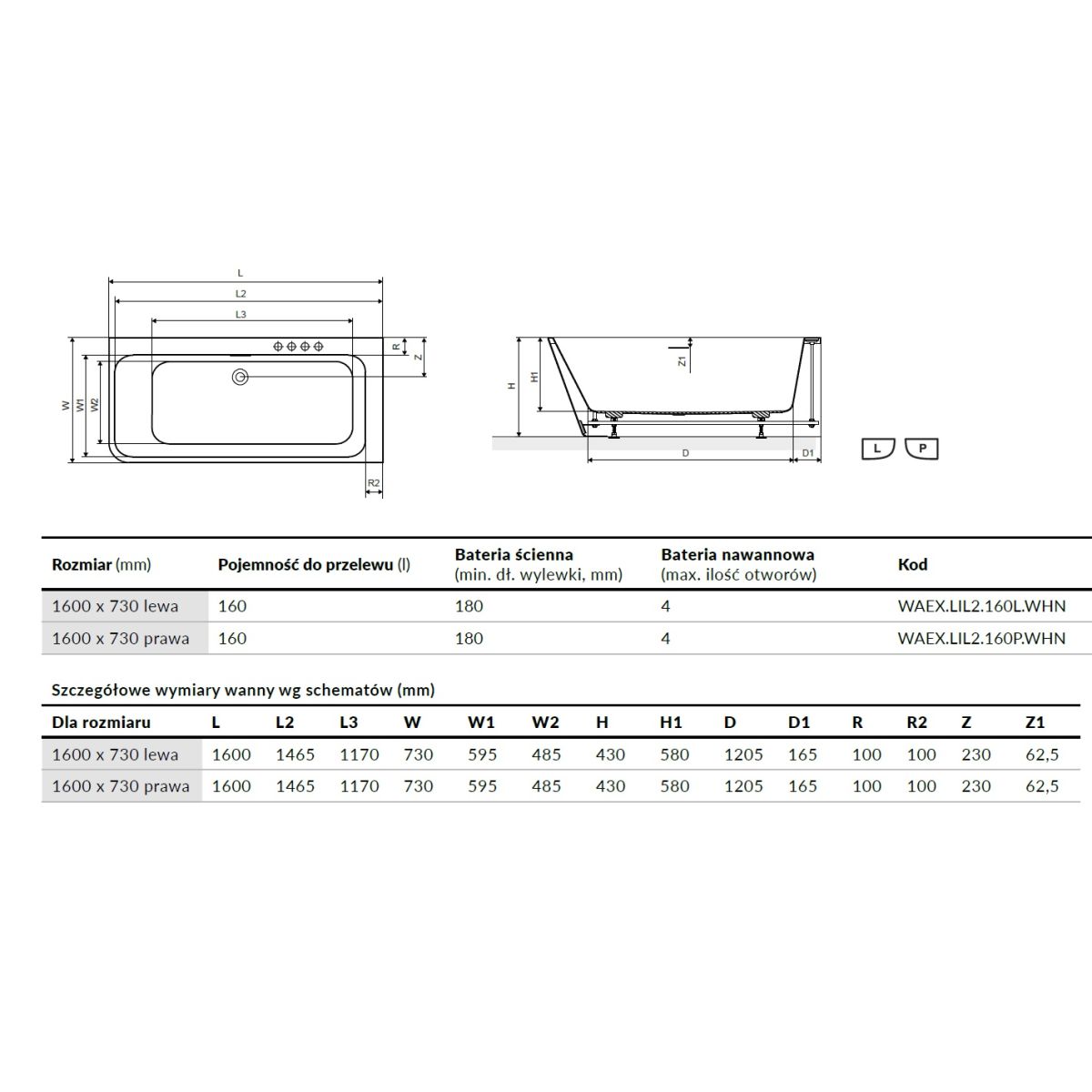 Excellent Lila 2.0 Eckbadewanne 160x73 cm rechteckig weiß WAEX.LIL2.160P.WHN