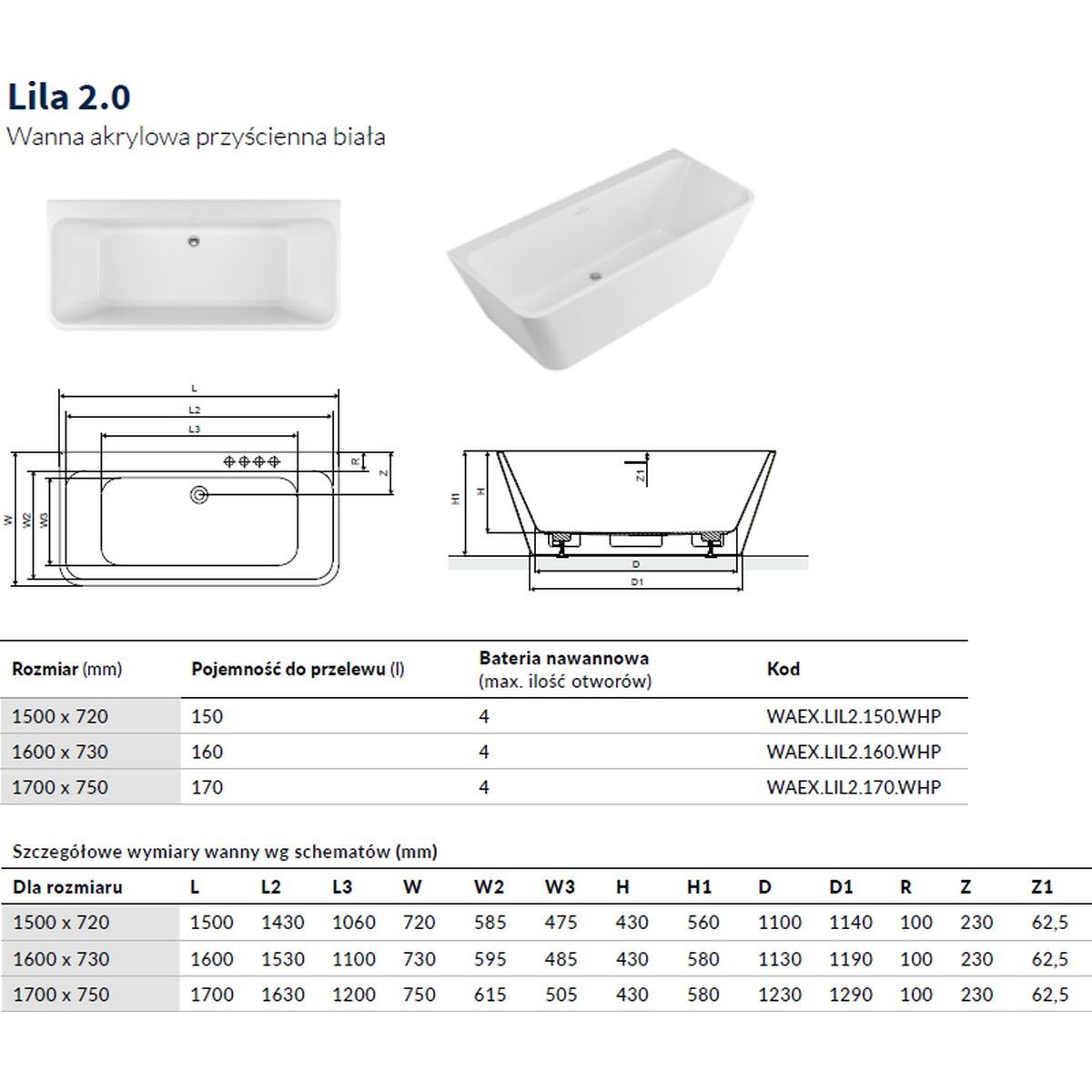 Excellent Lila 2.0 Wandmontierte Badewanne 160x73 cm rechteckig weiß WAEX.LIL2.160.WHP