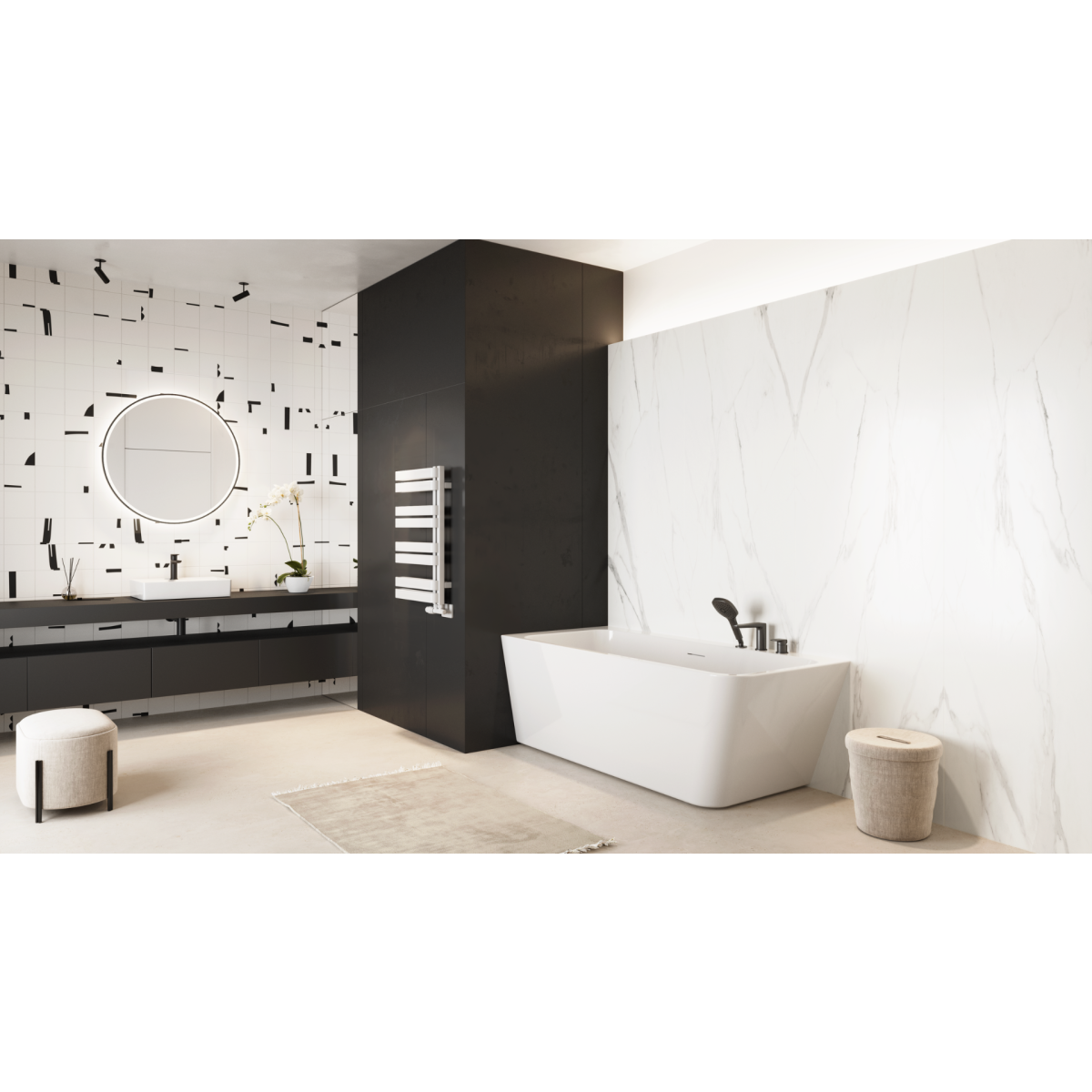Meteor ist eine beliebte Serie von Badheizkörpern, die so konzipiert wurde, dass sie den Erwartungen einer breiten Kundengruppe gerecht wird. Die beliebte Produktreihe mit „Leiter”-Anordnung wurde um eine Version mit asymmetrischen Heizkörpern erweitert. Die Konstruktion des Heizkörpers zeichnet sich durch eine originelle Form aus und findet sowohl in klassischen als auch in modernen Badezimmern Anwendung. Seine Bauweise macht ihn zu einer universellen Lösung – der Heizkörper kann mit vertikalen Kollektoren auf der linken oder rechten Seite an die Wand gehängt werden (dazu muss der Heizkörper lediglich gedreht werden). Der Heizkörper hat breite, flache Profile, die paarweise mit Abstand zueinander angeordnet sind, sodass Handtücher leicht daran aufgehängt werden können. Die gewellten horizontalen Profile erhöhen die Wärmeeffizienz dieses Heizkörpermodells erheblich. Der Heizkörper kann mit einem elektrischen Heizelement ausgestattet werden und eignet sich daher perfekt als ganzjähriger Handtuchtrockner. Der Heizkörper ist in zwei Größen und zwei Farben erhältlich: Soft-Schwarz (RAL 9005) und Soft-Weiß (RAL 9016). Als Ergänzung zu den Meteor Side-Heizkörpern werden Ventile und elektrische Heizelemente von Excellent empfohlen.