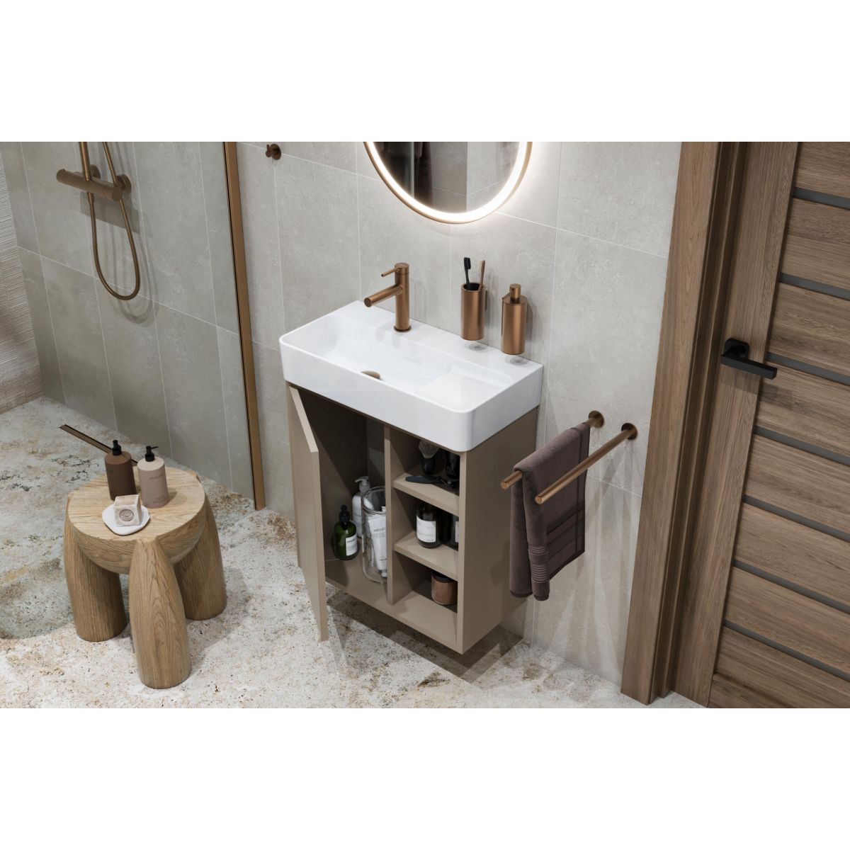 Die funktionale Konstruktion verbindet Komfort mit Ästhetik. Der verschließbare Teil mit Türen, die mit einem Soft-Close-System ausgestattet sind, verbirgt diskret die Wasser- und Abwasserinstallationen und bietet gleichzeitig zusätzlichen Stauraum. Offene Regale ermöglichen einen einfachen Zugriff auf die wichtigsten Accessoires oder können als Dekoration dienen.