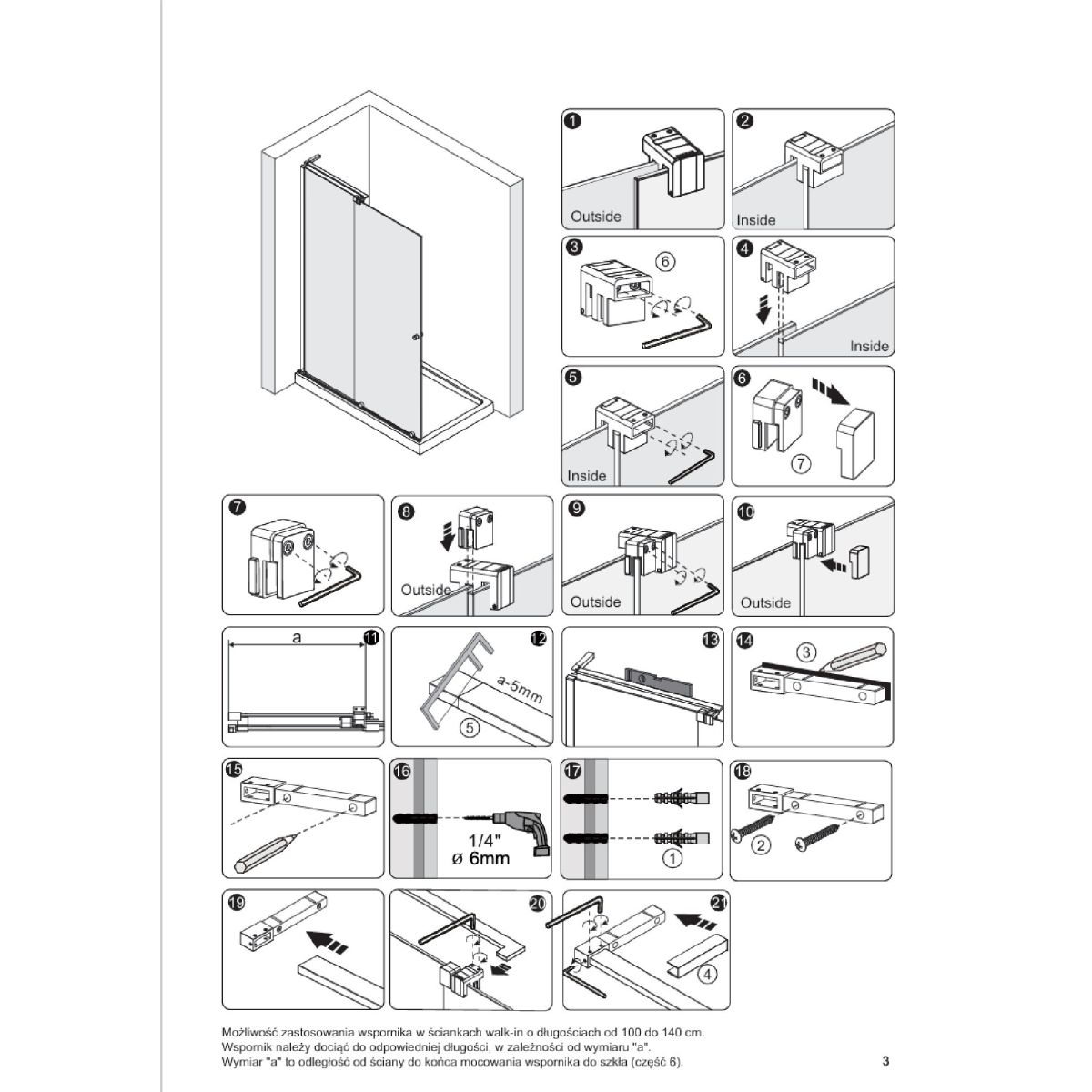 Die Winkelhalterung „L” wird als alternativer Stabilisator bei der Montage von Walk-in-Duschwänden, Eckkabinen oder Nischentüren verwendet. Die Ortigo-Winkelhalterung wird bei Wänden mit einer Gesamtlänge von 100 bis 140 cm verwendet. Sie findet vor allem bei kleineren Schiebewand-Duschkabinen Anwendung, bei denen es zu einer Kollision zwischen dem Duschkopf und der klassischen, senkrecht zur Kabinenwand montierten Halterung kommen kann. Er ist in den Farben Chrom, Mattschwarz und Goldglanz erhältlich.
